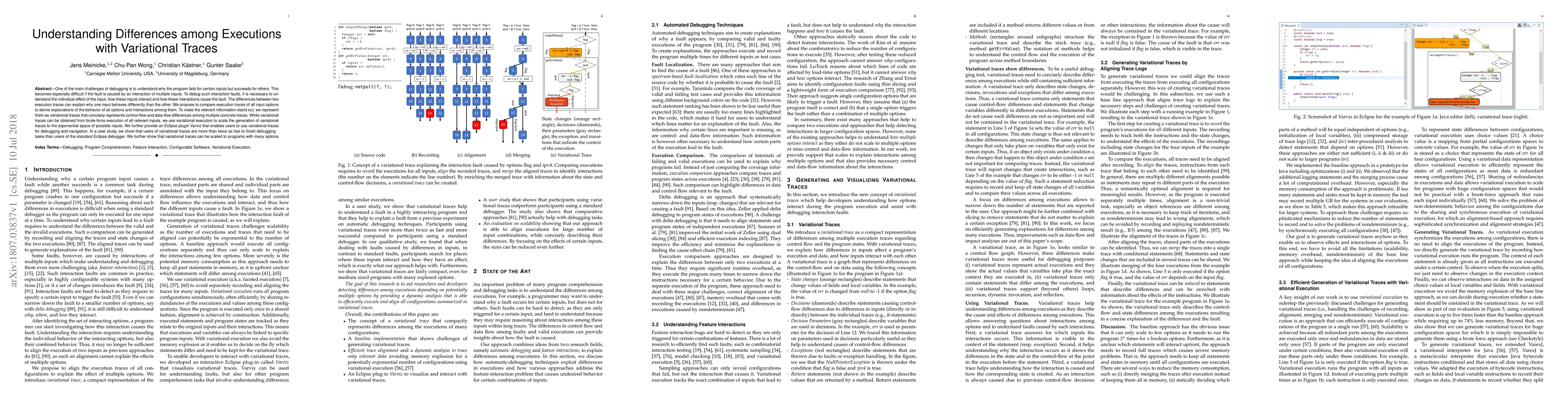 One of the main challenges of debugging is to understand why the program fails for certain inputs but succeeds for others. This becomes especially difficult if the fault is caused by an interaction of multiple inputs. To debug such interaction faults, it is necessary to understand the individual effect of the input, how these inputs interact and how these interactions cause the fault. The differences between two execution traces can explain why one input behaves differently than the other. We propose to compare execution traces of all input options to derive explanations of the behavior of all options and interactions among them. To make the relevant information stand out, we represent them as variational traces that concisely represents control-flow and data-flow differences among multiple concrete traces. While variational traces can be obtained from brute-force execution of all relevant inputs, we use variational execution to scale the generation of variational traces to the exponential space of possible inputs. We further provide an Eclipse plugin Varviz that enables users to use variational traces for debugging and navigation. In a user study, we show that users of variational traces are more than twice as fast to finish debugging tasks than users of the standard Eclipse debugger. We further show that variational traces can be scaled to programs with many options.