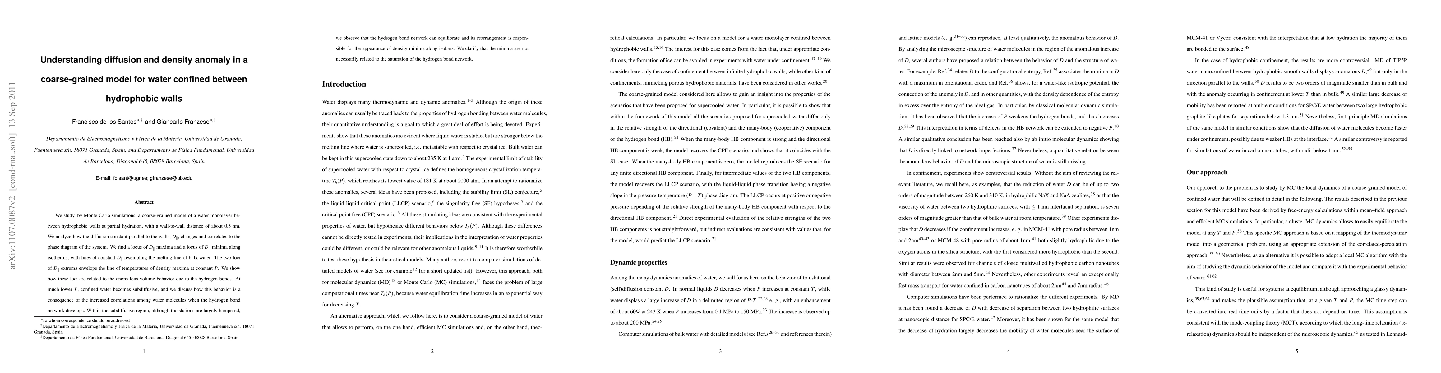 This study uses Monte Carlo simulations to investigate a coarse-grained water monolayer between hydrophobic walls, revealing a complex relationship between diffusion constant $D_{\parallel}$ and density anomalies. The research identifies loci of $D_{\parallel}$ extrema correlating with the melting line of bulk water and anomalous volume behavior due to hydrogen bonding, while subdiffusive behavior at lower temperatures results from increased molecular correlations.