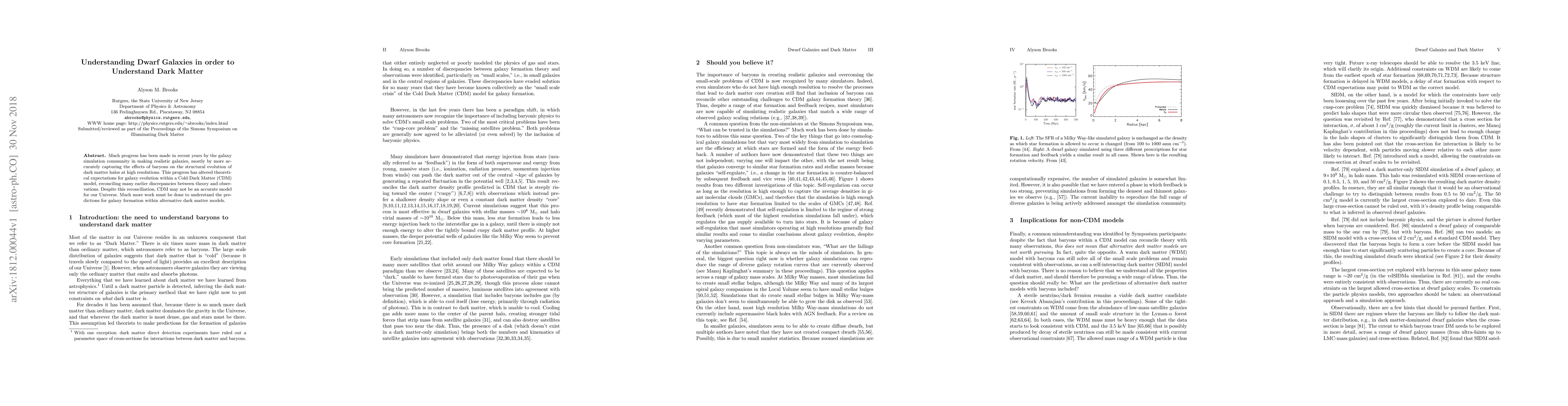 Much progress has been made in recent years by the galaxy simulation community in making realistic galaxies, mostly by more accurately capturing the effects of baryons on the structural evolution of dark matter halos at high resolutions. This progress has altered theoretical expectations for galaxy evolution within a Cold Dark Matter (CDM) model, reconciling many earlier discrepancies between theory and observations. Despite this reconciliation, CDM may not be an accurate model for our Universe. Much more work must be done to understand the predictions for galaxy formation within alternative dark matter models.