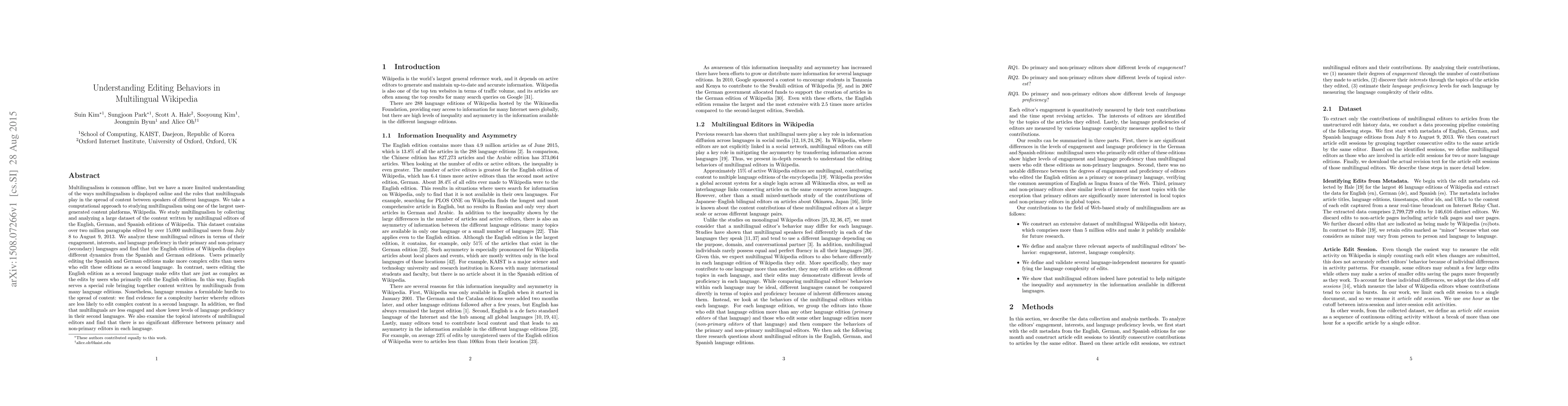 This study computationally analyzes multilingual editing behaviors on Wikipedia, focusing on the English, German, and Spanish editions. It reveals that multilingual editors exhibit different engagement and complexity levels based on their primary and secondary language use, with English serving as a unique bridge for multilingual content. However, language proficiency and engagement drop in secondary languages, highlighting a complexity barrier in cross-language editing.
