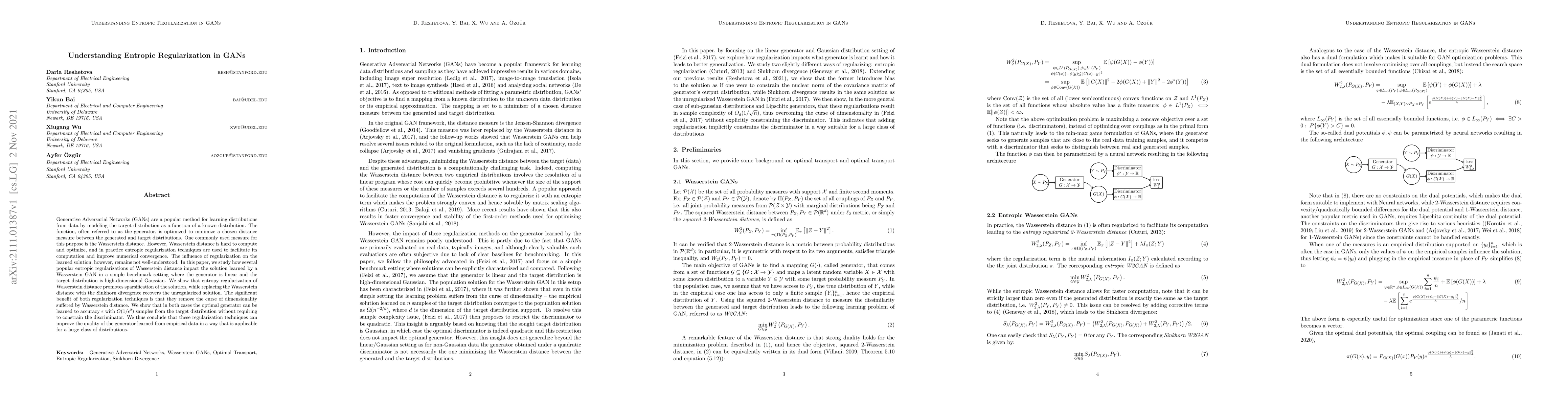 Generative Adversarial Networks are a popular method for learning distributions from data by modeling the target distribution as a function of a known distribution. The function, often referred to as the generator, is optimized to minimize a chosen distance measure between the generated and target distributions. One commonly used measure for this purpose is the Wasserstein distance. However, Wasserstein distance is hard to compute and optimize, and in practice entropic regularization techniques are used to improve numerical convergence. The influence of regularization on the learned solution, however, remains not well-understood. In this paper, we study how several popular entropic regularizations of Wasserstein distance impact the solution in a simple benchmark setting where the generator is linear and the target distribution is high-dimensional Gaussian. We show that entropy regularization promotes the solution sparsification, while replacing the Wasserstein distance with the Sinkhorn divergence recovers the unregularized solution. Both regularization techniques remove the curse of dimensionality suffered by Wasserstein distance. We show that the optimal generator can be learned to accuracy $\epsilon$ with $O(1/\epsilon^2)$ samples from the target distribution. We thus conclude that these regularization techniques can improve the quality of the generator learned from empirical data for a large class of distributions.