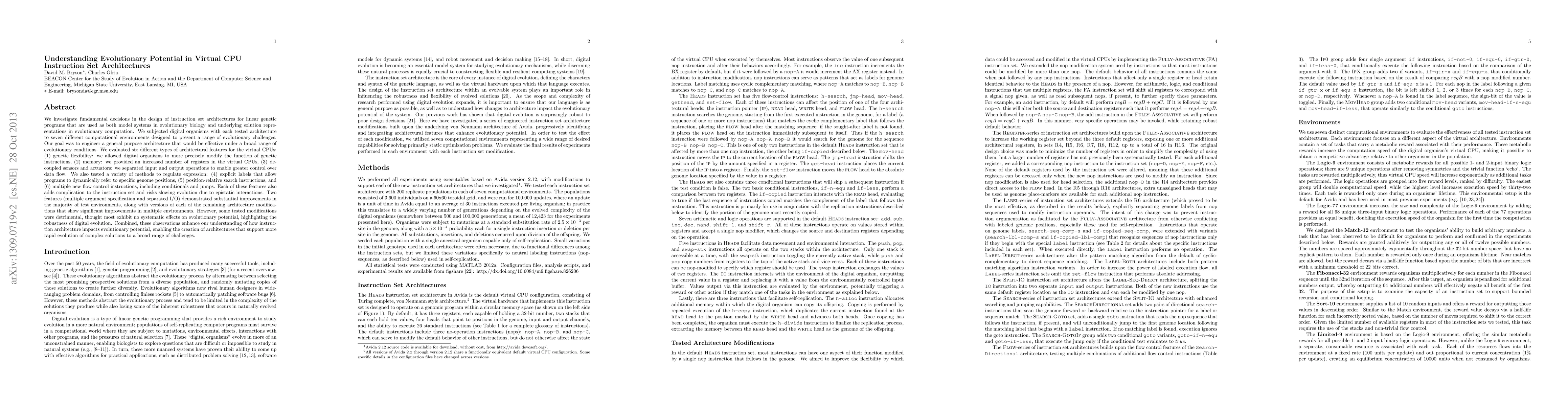 This paper explores the design of instruction set architectures for virtual CPUs used in evolutionary biology and computation. It evaluates various architectural features, including genetic flexibility, memory, and control instructions, to engineer a versatile architecture effective across diverse evolutionary contexts. The study found that multiple argument specification and separated I/O significantly improved performance, while other features had mixed effects, underscoring the robustness of digital evolution and informing the creation of more adaptable evolutionary architectures.