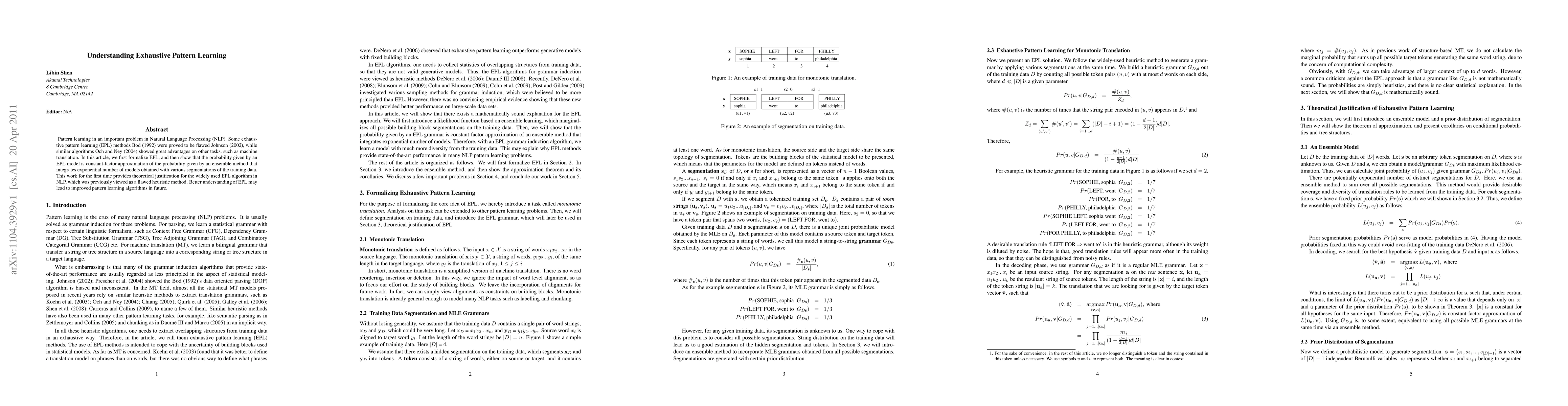 Pattern learning in an important problem in Natural Language Processing (NLP). Some exhaustive pattern learning (EPL) methods (Bod, 1992) were proved to be flawed (Johnson, 2002), while similar algorithms (Och and Ney, 2004) showed great advantages on other tasks, such as machine translation. In this article, we first formalize EPL, and then show that the probability given by an EPL model is constant-factor approximation of the probability given by an ensemble method that integrates exponential number of models obtained with various segmentations of the training data. This work for the first time provides theoretical justification for the widely used EPL algorithm in NLP, which was previously viewed as a flawed heuristic method. Better understanding of EPL may lead to improved pattern learning algorithms in future.