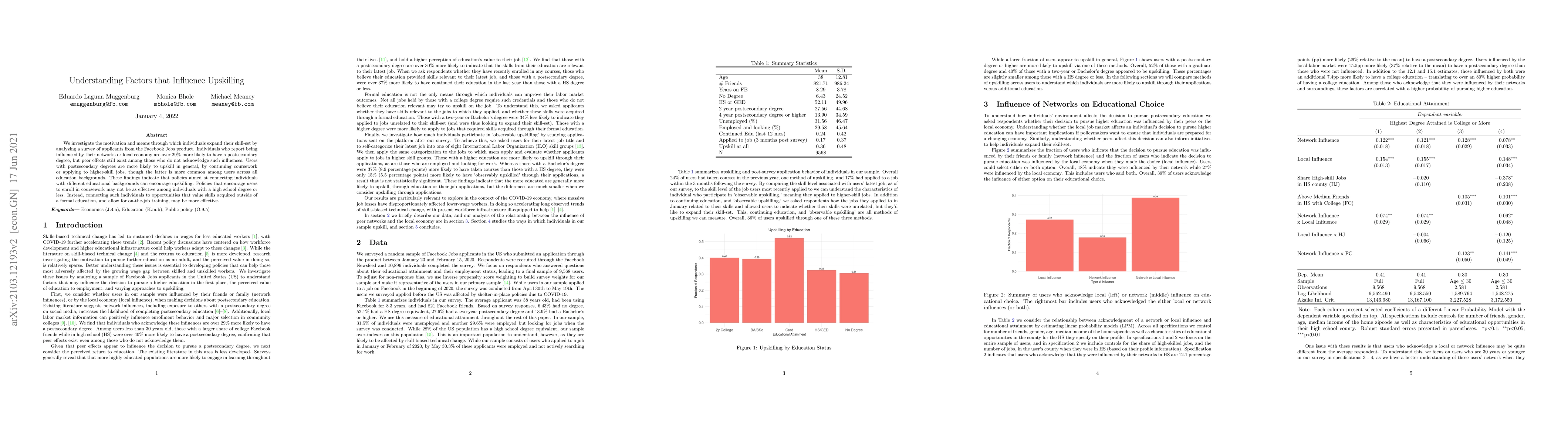 We investigate the motivation and means through which individuals expand their skill-set by analyzing a survey of applicants from the Facebook Jobs product. Individuals who report being influenced by their networks or local economy are over 29% more likely to have a postsecondary degree, but peer effects still exist among those who do not acknowledge such influences. Users with postsecondary degrees are more likely to upskill in general, by continuing coursework or applying to higher-skill jobs, though the latter is more common among users across all education backgrounds. These findings indicate that policies aimed at connecting individuals with different educational backgrounds can encourage upskilling. Policies that encourage users to enroll in coursework may not be as effective among individuals with a high school degree or less. Instead, connecting such individuals to opportunities that value skills acquired outside of a formal education, and allow for on-the-job training, may be more effective.
