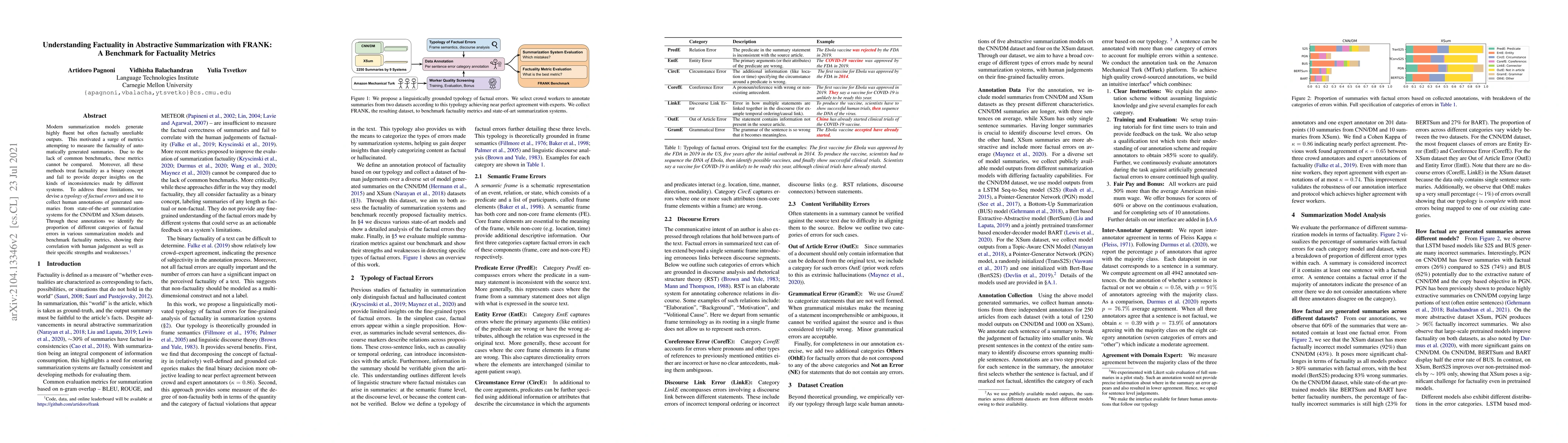 This paper introduces FRANK, a benchmark for evaluating factuality in abstractive summarization, addressing the lack of common metrics and deeper insights into factual errors. It categorizes factual inconsistencies and provides human annotations to assess the performance of various summarization models and metrics against human judgment.