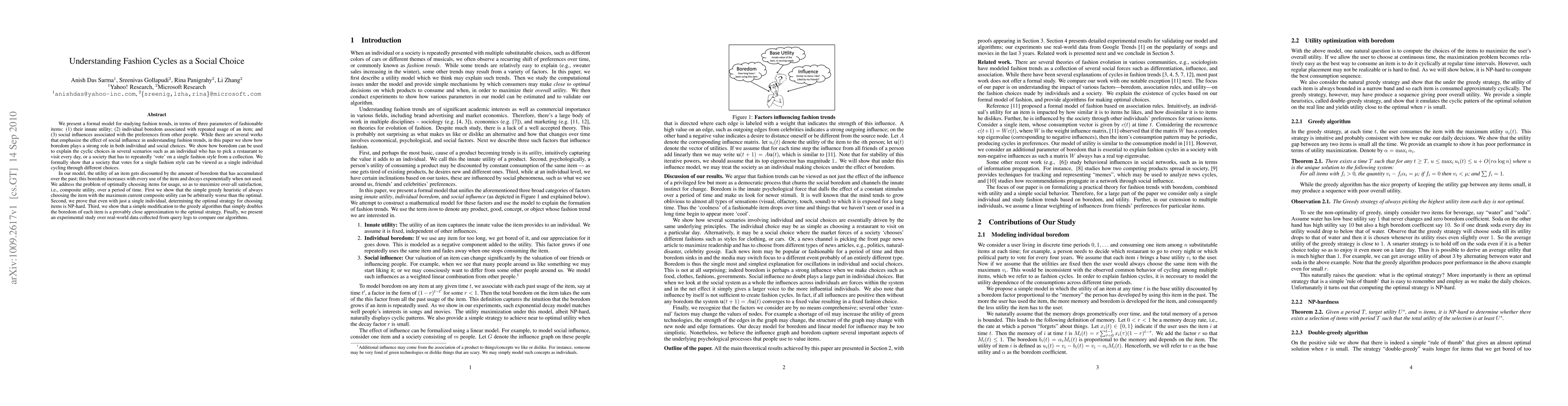 We present a formal model for studying fashion trends, in terms of three parameters of fashionable items: (1) their innate utility; (2) individual boredom associated with repeated usage of an item; and (3) social influences associated with the preferences from other people. While there are several works that emphasize the effect of social influence in understanding fashion trends, in this paper we show how boredom plays a strong role in both individual and social choices. We show how boredom can be used to explain the cyclic choices in several scenarios such as an individual who has to pick a restaurant to visit every day, or a society that has to repeatedly `vote' on a single fashion style from a collection. We formally show that a society that votes for a single fashion style can be viewed as a single individual cycling through different choices. In our model, the utility of an item gets discounted by the amount of boredom that has accumulated over the past; this boredom increases with every use of the item and decays exponentially when not used. We address the problem of optimally choosing items for usage, so as to maximize over-all satisfaction, i.e., composite utility, over a period of time. First we show that the simple greedy heuristic of always choosing the item with the maximum current composite utility can be arbitrarily worse than the optimal. Second, we prove that even with just a single individual, determining the optimal strategy for choosing items is NP-hard. Third, we show that a simple modification to the greedy algorithm that simply doubles the boredom of each item is a provably close approximation to the optimal strategy. Finally, we present an experimental study over real-world data collected from query logs to compare our algorithms.