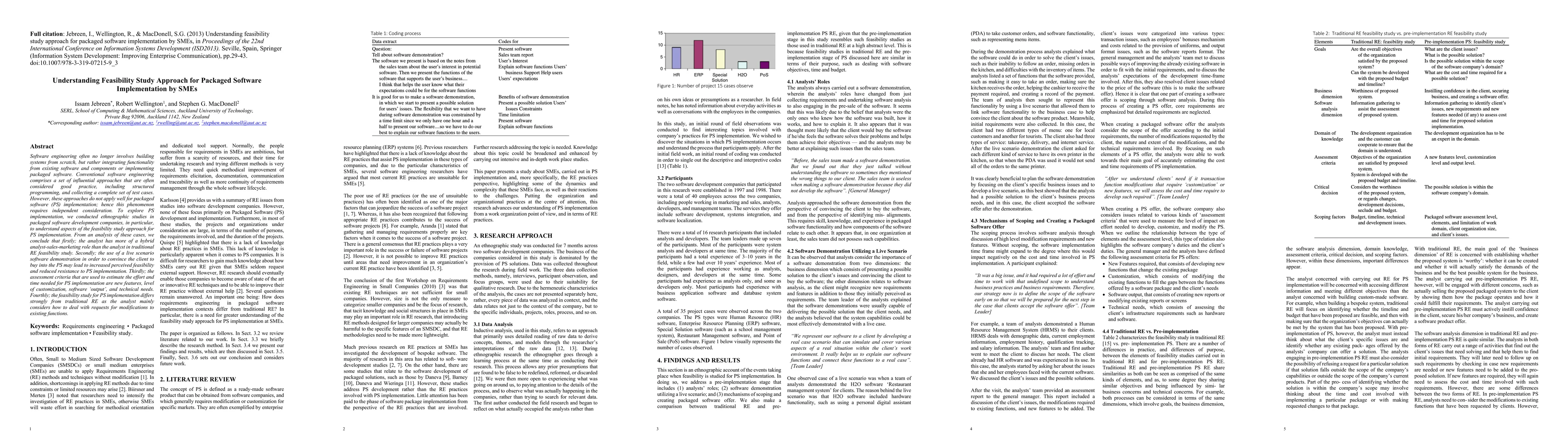 A feasibility study approach for packaged software implementation by SMEs was explored through ethnographic studies, revealing key differences from traditional RE approaches, including a hybrid analyst role and assessment criteria focusing on customization and technical needs.