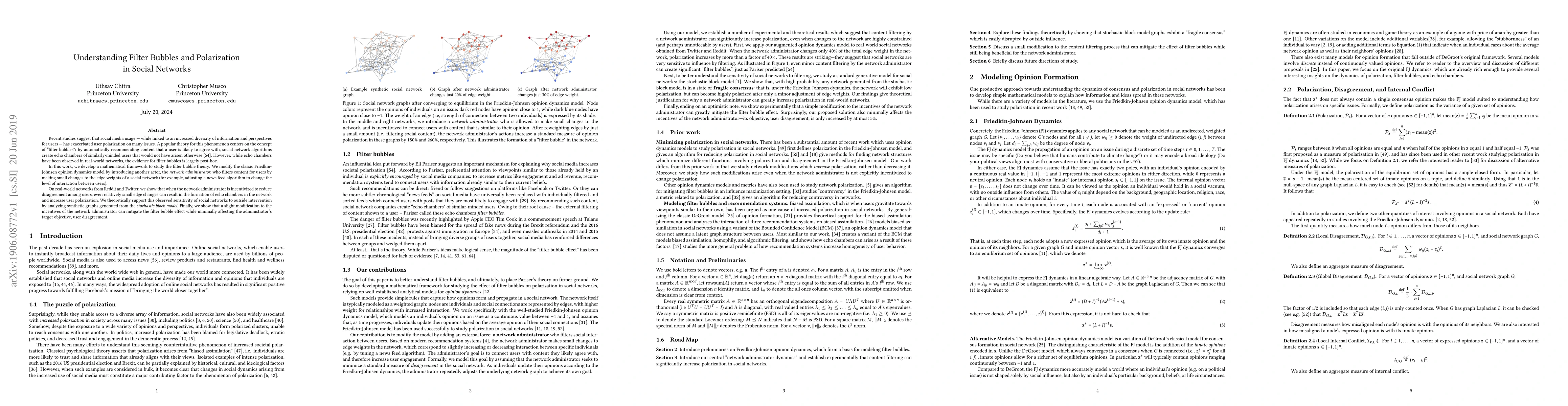 This paper develops a mathematical framework to explore the filter bubble theory, showing that small algorithmic changes by network administrators can create echo chambers and increase polarization on social media. The study finds that modifying incentives can mitigate these effects while maintaining the goal of reducing user disagreement.