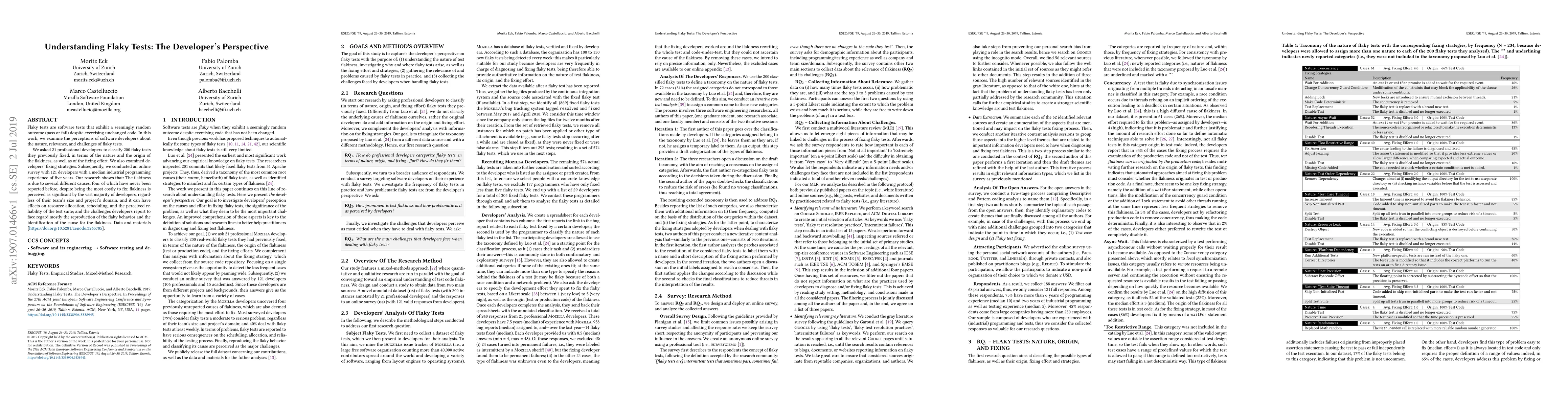 Flaky tests are software tests that exhibit a seemingly random outcome (pass or fail) when run against the same, identical code. Previous work has examined fixes to flaky tests and has proposed automated solutions to locate as well as fix flaky tests--we complement it by examining the perceptions of software developers about the nature, relevance, and challenges of this phenomenon. We asked 21 professional developers to classify 200 flaky tests they previously fixed, in terms of the nature of the flakiness, the origin of the flakiness, and the fixing effort. We complement this analysis with information about the fixing strategy. Subsequently, we conducted an online survey with 121 developers with a median industrial programming experience of five years. Our research shows that: The flakiness is due to several different causes, four of which have never been reported before, despite being the most costly to fix; flakiness is perceived as significant by the vast majority of developers, regardless of their team's size and project's domain, and it can have effects on resource allocation, scheduling, and the perceived reliability of the test suite; and the challenges developers report to face regard mostly the reproduction of the flaky behavior and the identification of the cause for the flakiness. Data and materials [https://doi.org/10.5281/zenodo.3265785].