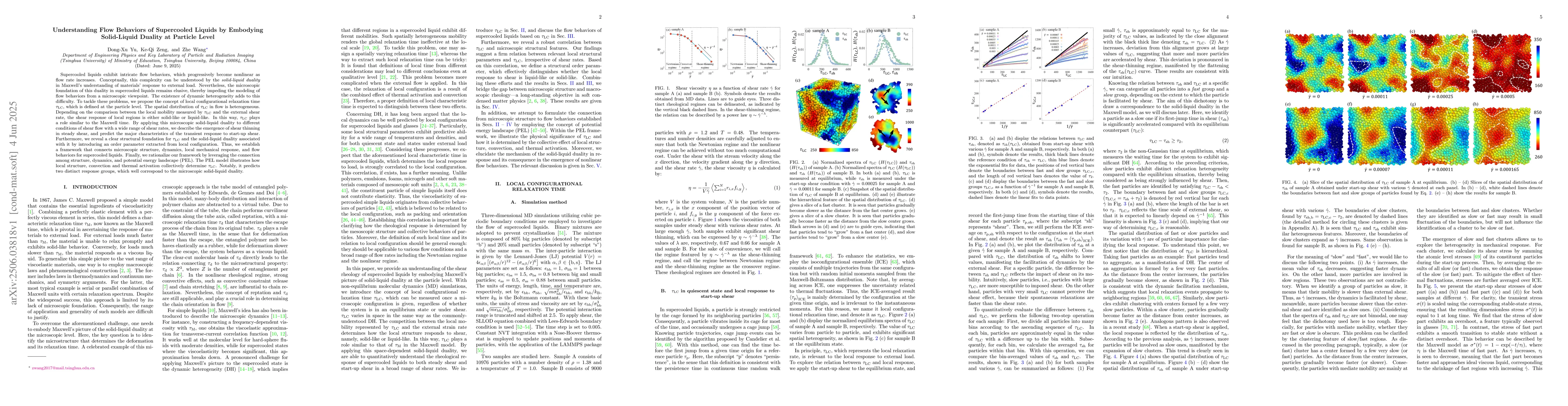 The introduction and application of the local configurational relaxation time $ au_ m{LC}$ to understand and predict the solid-liquid duality and flow behaviors in supercooled liquids at a microscopic level.