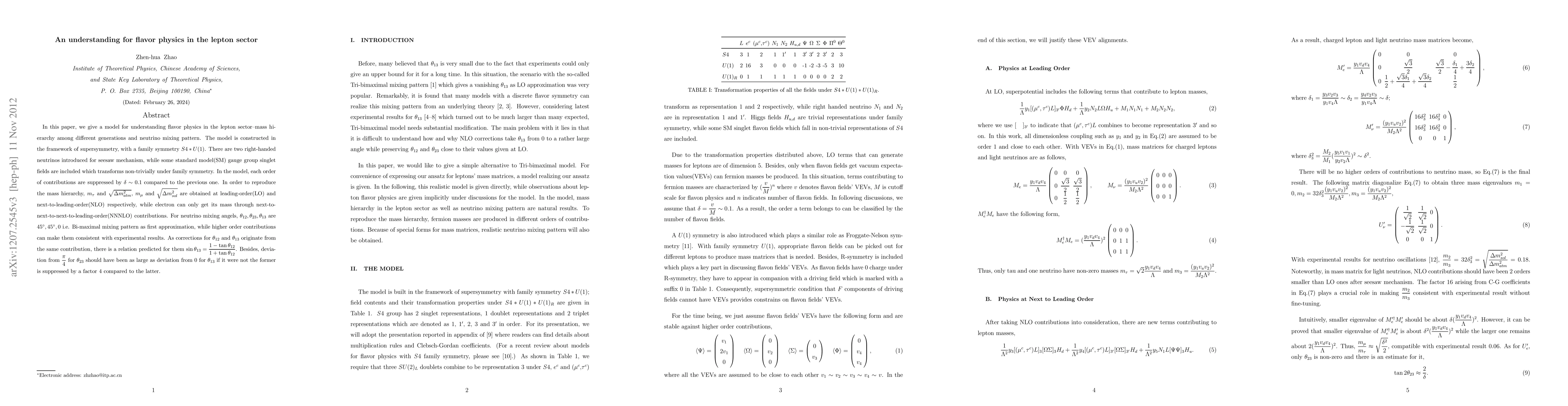In this paper, we give a model for understanding flavor physics in the lepton sector--mass hierarchy among different generations and neutrino mixing pattern. The model is constructed in the framework of supersymmetry, with a family symmetry $S4*U(1)$. There are two right-handed neutrinos introduced for seesaw mechanism, while some standard model(SM) gauge group singlet fields are included which transforms non-trivially under family symmetry. In the model, each order of contributions are suppressed by $\delta \sim 0.1$ compared to the previous one. In order to reproduce the mass hierarchy, $m_\tau$ and $\sqrt{\Delta m_{atm}^2}$, $m_\mu$ and $\sqrt{\Delta m_{sol}^2}$ are obtained at leading-order(LO) and next-to-leading-order(NLO) respectively, while electron can only get its mass through next-to-next-to-next-to-leading-order(NNNLO) contributions. For neutrino mixing angels, $\theta_{12}, \theta_{23}, \theta_{13}$ are $45^\circ, 45^\circ, 0$ i.e. Bi-maximal mixing pattern as first approximation, while higher order contributions can make them consistent with experimental results. As corrections for $\theta_{12}$ and $\theta_{13}$ originate from the same contribution, there is a relation predicted for them $\sin{\theta_{13}}=\displaystyle \frac{1-\tan{\theta_{12}}}{1+\tan{\theta_{12}}}$. Besides, deviation from $\displaystyle \frac{\pi}{4}$ for $\theta_{23}$ should have been as large as deviation from 0 for $\theta_{13}$ if it were not the former is suppressed by a factor 4 compared to the latter.