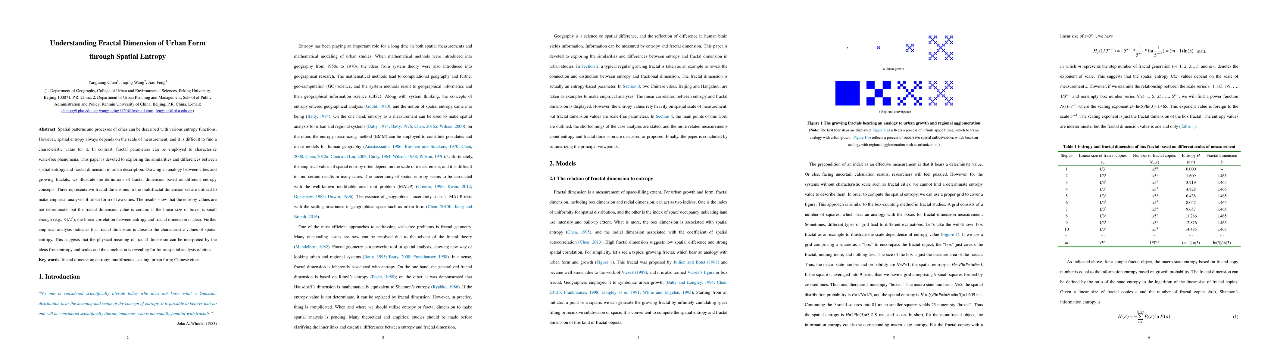 This paper investigates the relationship between spatial entropy and fractal dimension in describing urban form, finding that while entropy values are scale-dependent, fractal dimension provides a consistent measure. Empirical analysis of two cities shows a clear correlation between entropy and fractal dimension at small scales, suggesting fractal dimension can be interpreted through entropy concepts.