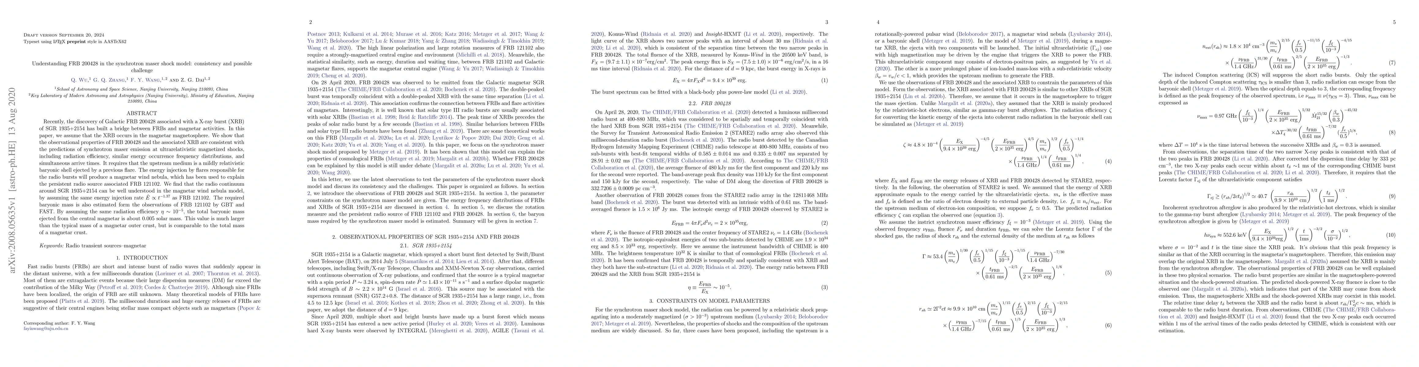 Recently, the discovery of Galactic FRB 200428 associated with a X-ray burst (XRB) of SGR 1935+2154 has built a bridge between FRBs and magnetar activities. In this paper, we assume that the XRB occurs in the magnetar magnetosphere. We show that the observational properties of FRB 200428 and the associated XRB are consistent with the predictions of synchrotron maser emission at ultrarelativistic magnetized shocks, including radiation efficiency, similar energy occurrence frequency distributions, and simultaneous arrive times. It requires that the upstream medium is a mildly relativistic baryonic shell ejected by a previous flare. The energy injection by flares responsible for the radio bursts will produce a magnetar wind nebula, which has been used to explain the persistent radio source associated FRB 121102. We find that the radio continuum around SGR 1935+2154 can be well understood in the magnetar wind nebula model, by assuming the same energy injection rate $\dot{E} \propto t^{-1.37}$ as FRB 121102. The required baryonic mass is also estimated form the observations of FRB 121102 by GBT and FAST. By assuming the same radiation efficiency $\eta \sim 10^{-5}$, the total baryonic mass ejected from the central magnetar is about 0.005 solar mass. This value is much larger than the typical mass of a magnetar outer crust, but is comparable to the total mass of a magnetar crust.