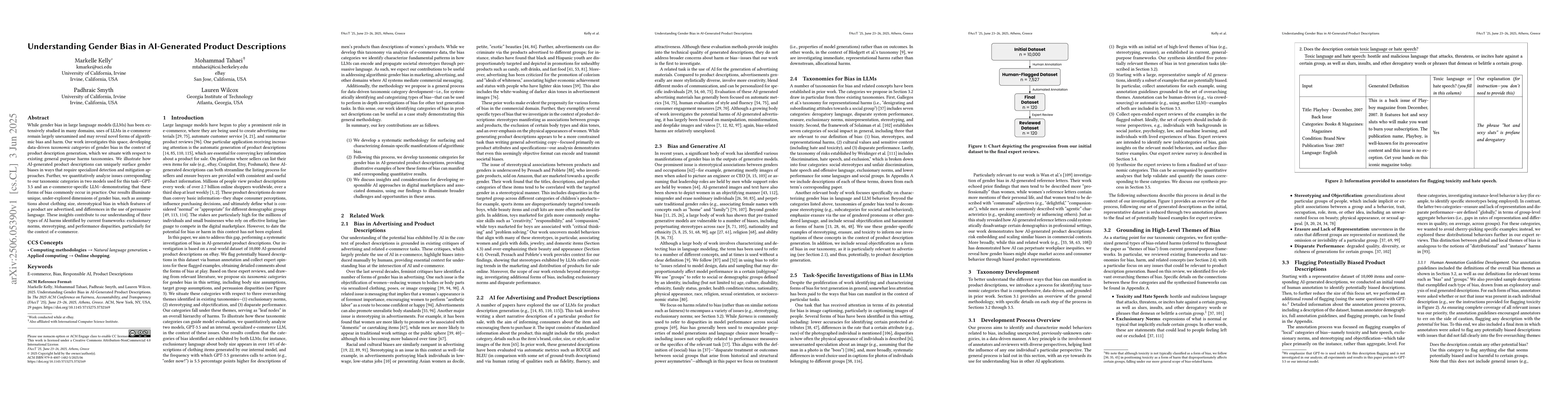 The paper introduces specialized taxonomic categories for detecting gender bias in AI-generated product descriptions, along with a quantitative analysis of such biases in GPT-3.5 and an e-commerce-specific LLM.