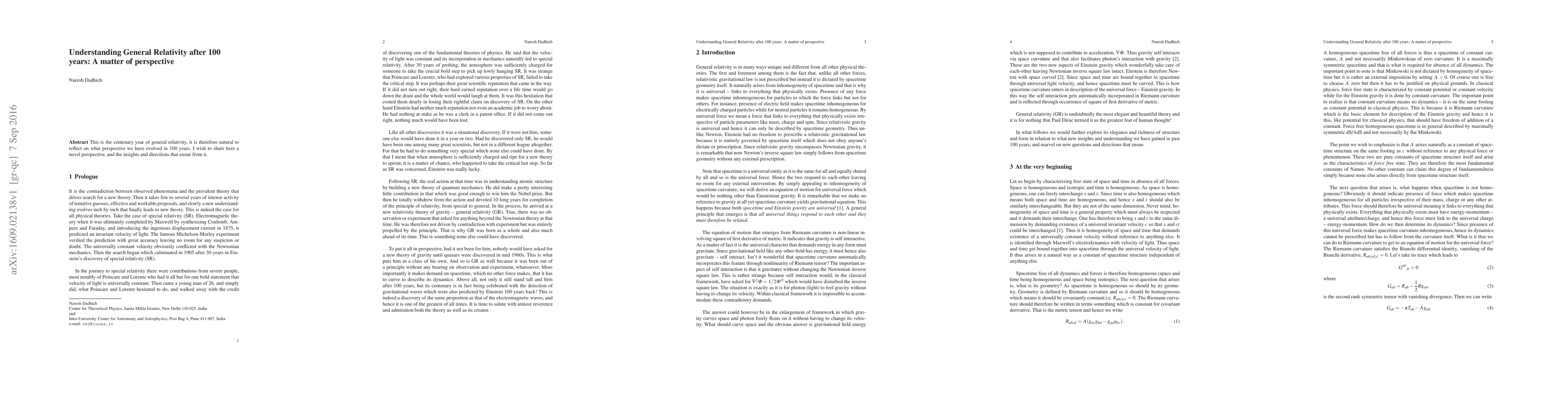 **Summary:** This paper reflects on the century-long evolution of our understanding of general relativity, presenting a novel perspective and new insights that emerge from it, marking the centenary year of this foundational theory in physics.