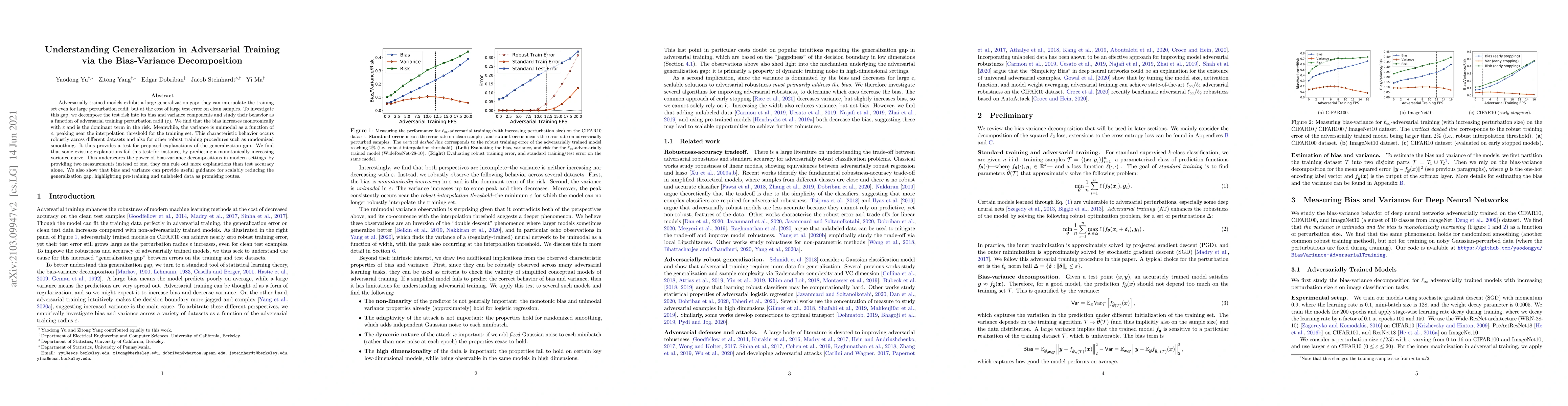 Researchers studied how adversarially trained models generalize to clean test samples, finding that bias increases with perturbation radius while variance peaks near interpolation threshold. This study highlights the power of bias-variance decompositions in understanding generalization gaps.