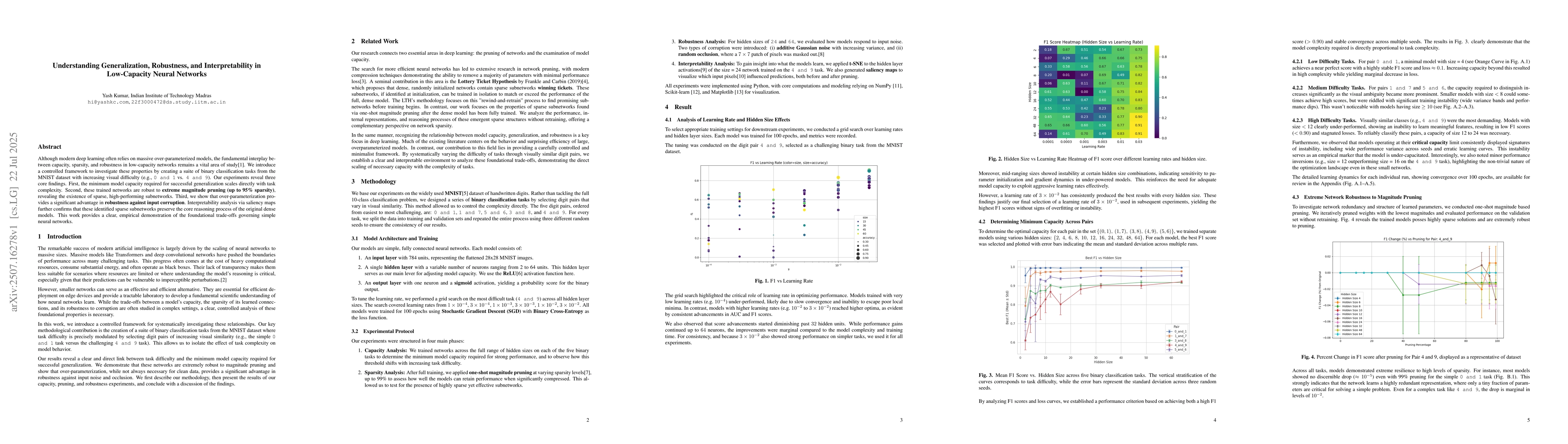 Although modern deep learning often relies on massive over-parameterized models, the fundamental interplay between capacity, sparsity, and robustness in low-capacity networks remains a vital area of study. We introduce a controlled framework to investigate these properties by creating a suite of binary classification tasks from the MNIST dataset with increasing visual difficulty (e.g., 0 and 1 vs. 4 and 9). Our experiments reveal three core findings. First, the minimum model capacity required for successful generalization scales directly with task complexity. Second, these trained networks are robust to extreme magnitude pruning (up to 95% sparsity), revealing the existence of sparse, high-performing subnetworks. Third, we show that over-parameterization provides a significant advantage in robustness against input corruption. Interpretability analysis via saliency maps further confirms that these identified sparse subnetworks preserve the core reasoning process of the original dense models. This work provides a clear, empirical demonstration of the foundational trade-offs governing simple neural networks.
