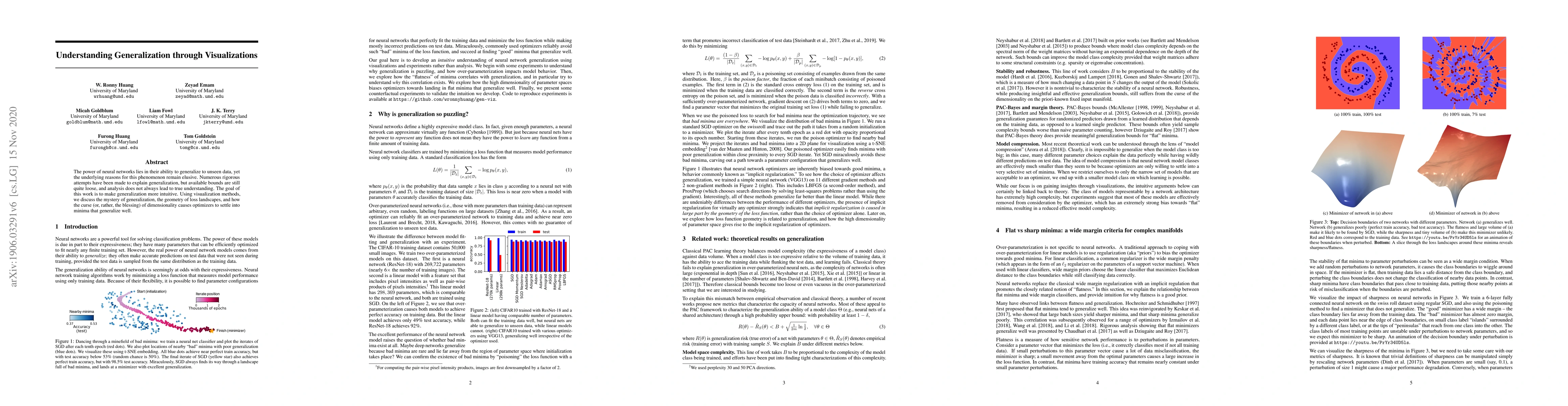 This paper uses visualizations to explain why neural networks can generalize well to unseen data, revealing how optimizers get stuck in local minima that lead to good generalization. It aims to make generalization more intuitive by highlighting the role of dimensionality in achieving this phenomenon.