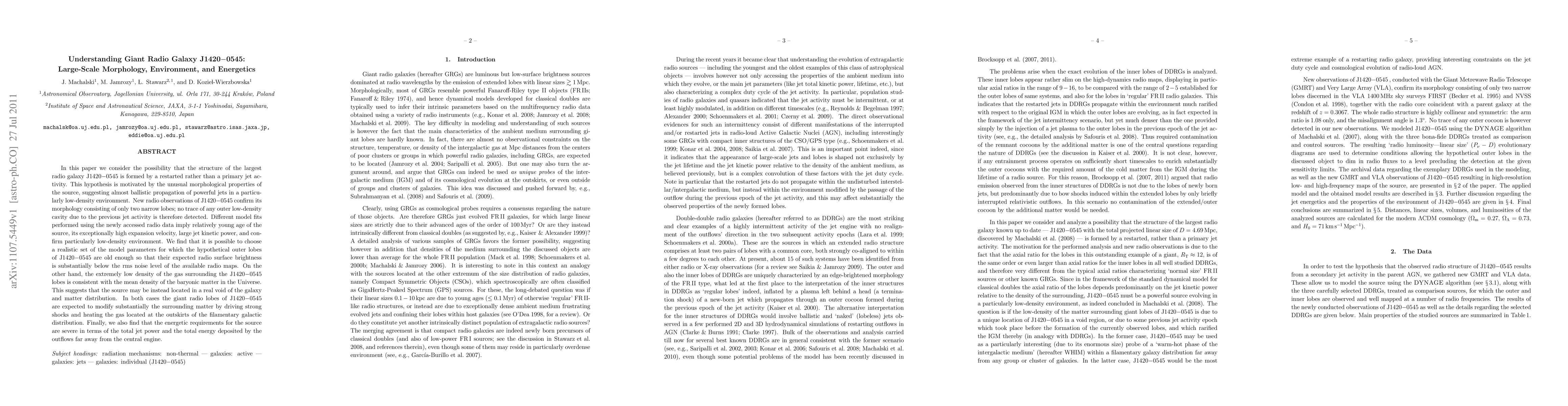 In this paper we consider the possibility that the structure of the largest radio galaxy J1420-0545 is formed by a restarted rather than a primary jet activity. This hypothesis is motivated by the unusual morphological properties of the source, suggesting almost ballistic propagation of powerful jets in a particularly low-density environment. New radio observations of J1420-0545 confirm its morphology consisting of only two narrow lobes; no trace of any outer low-density cavity due to the previous jet activity is therefore detected. Different model fits performed using the newly accessed radio data imply relatively young age of the source, its exceptionally high expansion velocity, large jet kinetic power, and confirm particularly low-density environment. We find that it is possible to choose a realistic set of the model parameters for which the hypothetical outer lobes of J1420-0545 are old enough so that their expected radio surface brightness is substantially below the rms noise level of the available radio maps. On the other hand, the extremely low density of the gas surrounding the J1420-0545 lobes is consistent with the mean density of the baryonic matter in the Universe. This suggests that the source may be instead located in a real void of the galaxy and matter distribution. In both cases the giant radio lobes of J1420-0545 are expected to modify substantially the surrounding matter by driving strong shocks and heating the gas located at the outskirts of the filamentary galactic distribution. Finally, we also find that the energetic requirements for the source are severe in terms of the total jet power and the total energy deposited by the outflows far away from the central engine.