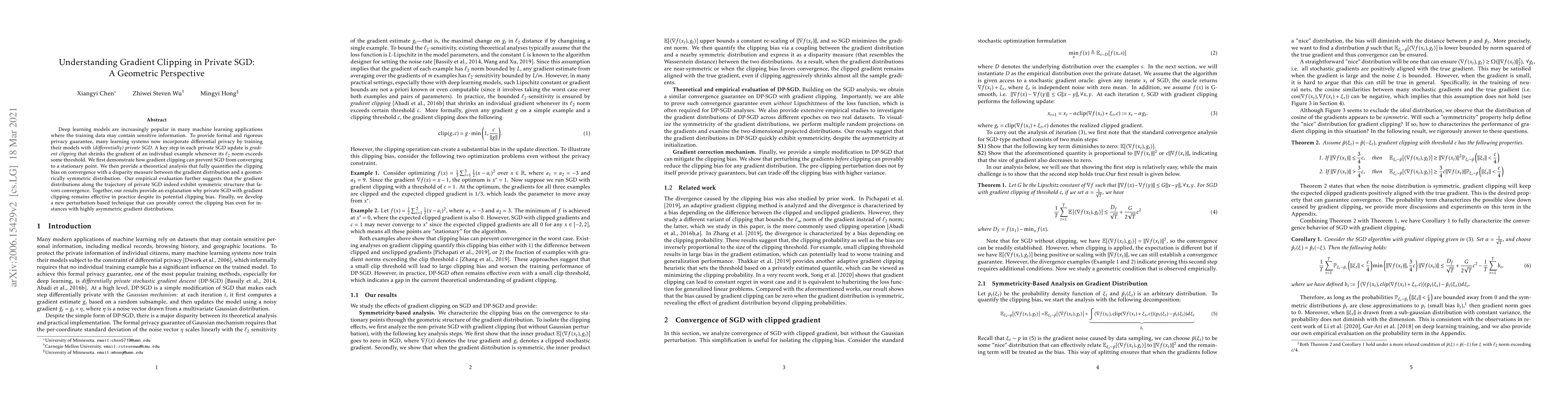 This paper explores the role of gradient clipping in private SGD from a geometric perspective, demonstrating that it can prevent convergence to a stationary point. It provides a theoretical analysis quantifying the clipping bias and shows that private SGD still converges effectively due to symmetric gradient distributions. The study also proposes a new technique to correct the clipping bias.