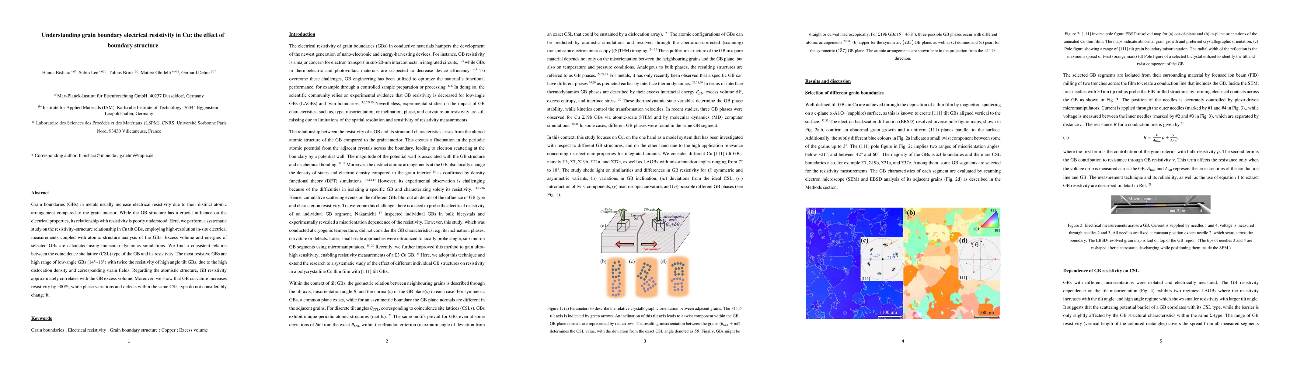 This study investigates the relationship between grain boundary structure and electrical resistivity in Cu, revealing that high-angle tilt grain boundaries exhibit higher resistivity due to higher dislocation density and strain fields. The research finds a correlation between GB resistivity and its excess volume, with GB curvature significantly increasing resistivity by about 80%.