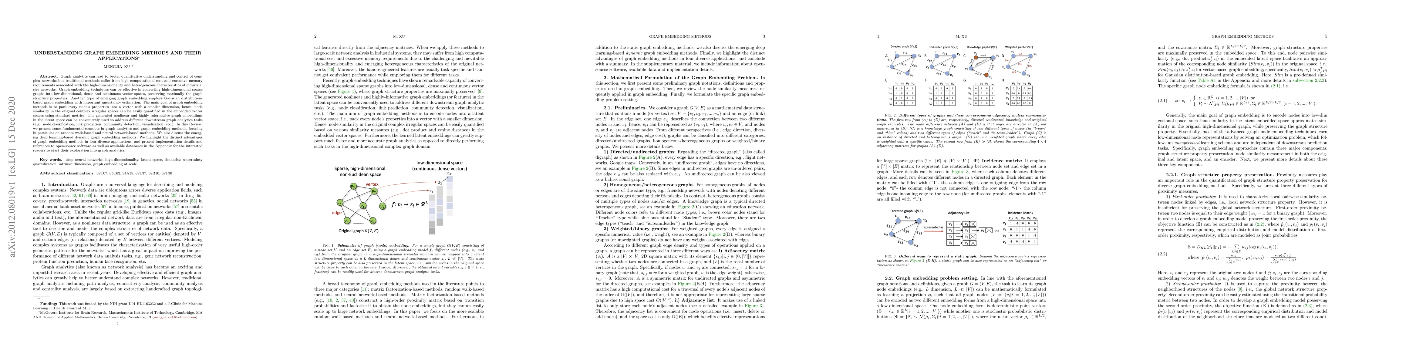 Graph analytics can lead to better quantitative understanding and control of complex networks, but traditional methods suffer from high computational cost and excessive memory requirements associated with the high-dimensionality and heterogeneous characteristics of industrial size networks. Graph embedding techniques can be effective in converting high-dimensional sparse graphs into low-dimensional, dense and continuous vector spaces, preserving maximally the graph structure properties. Another type of emerging graph embedding employs Gaussian distribution-based graph embedding with important uncertainty estimation. The main goal of graph embedding methods is to pack every node's properties into a vector with a smaller dimension, hence, node similarity in the original complex irregular spaces can be easily quantified in the embedded vector spaces using standard metrics. The generated nonlinear and highly informative graph embeddings in the latent space can be conveniently used to address different downstream graph analytics tasks (e.g., node classification, link prediction, community detection, visualization, etc.). In this Review, we present some fundamental concepts in graph analytics and graph embedding methods, focusing in particular on random walk-based and neural network-based methods. We also discuss the emerging deep learning-based dynamic graph embedding methods. We highlight the distinct advantages of graph embedding methods in four diverse applications, and present implementation details and references to open-source software as well as available databases in the Appendix for the interested readers to start their exploration into graph analytics.