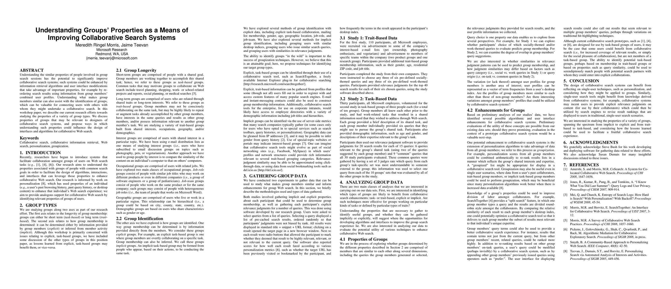Research aims to understand group similarities to improve collaborative search systems by analyzing properties of diverse groups and proposing design influences on interfaces and algorithms.