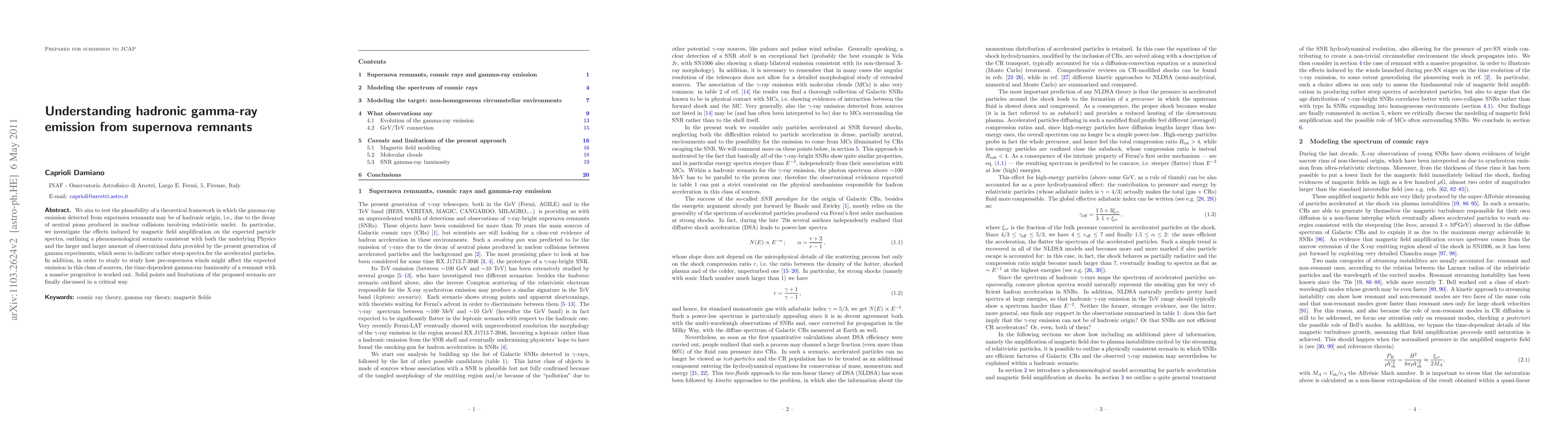 This paper explores the possibility that gamma-ray emissions from supernova remnants are of hadronic origin, resulting from neutral pion decay in nuclear collisions. It investigates the impact of magnetic field amplification on particle spectra and the influence of pre-supernova winds on gamma-ray luminosity, while critically assessing the strengths and limitations of the proposed theoretical framework.