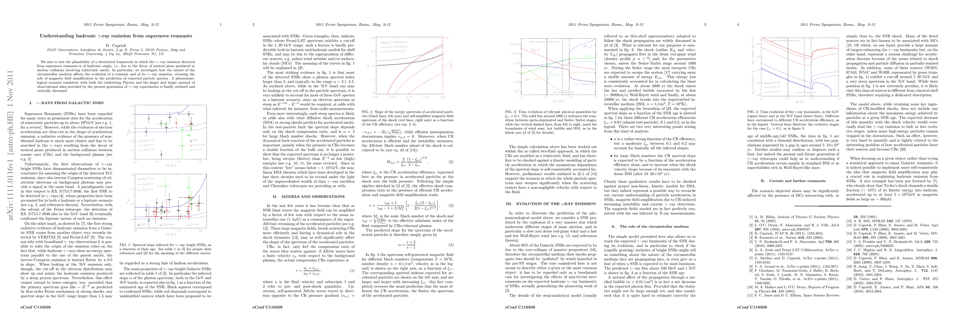 This paper tests the theory of hadronic $\gamma$-ray emission from supernova remnants, attributing it to neutral pion decay in nuclear collisions. It examines the impact of the circumstellar medium and magnetic field amplification on remnant evolution and $\gamma$-ray spectra, aligning a phenomenological model with observational data from current $\gamma$-ray experiments.