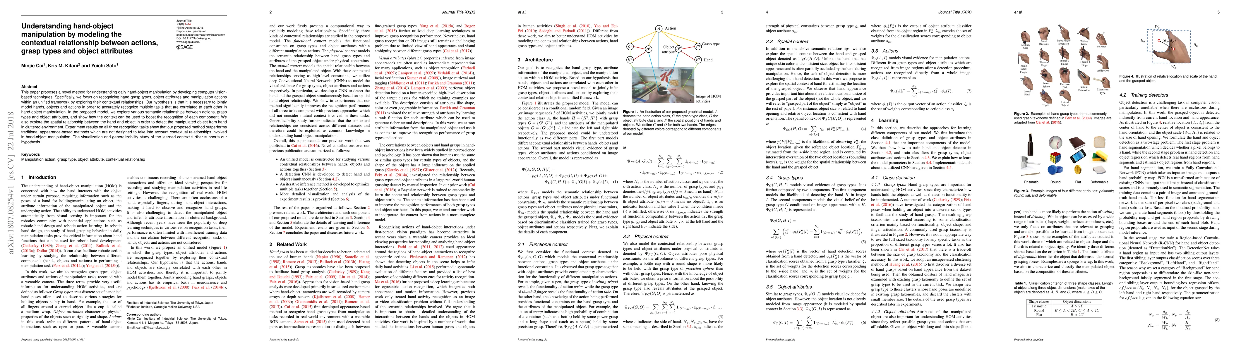 This paper introduces a novel computer vision method to recognize hand grasp types, object attributes, and manipulation actions by modeling their contextual relationships. The results demonstrate improved performance over traditional methods, highlighting the importance of contextual modeling in hand-object manipulation.