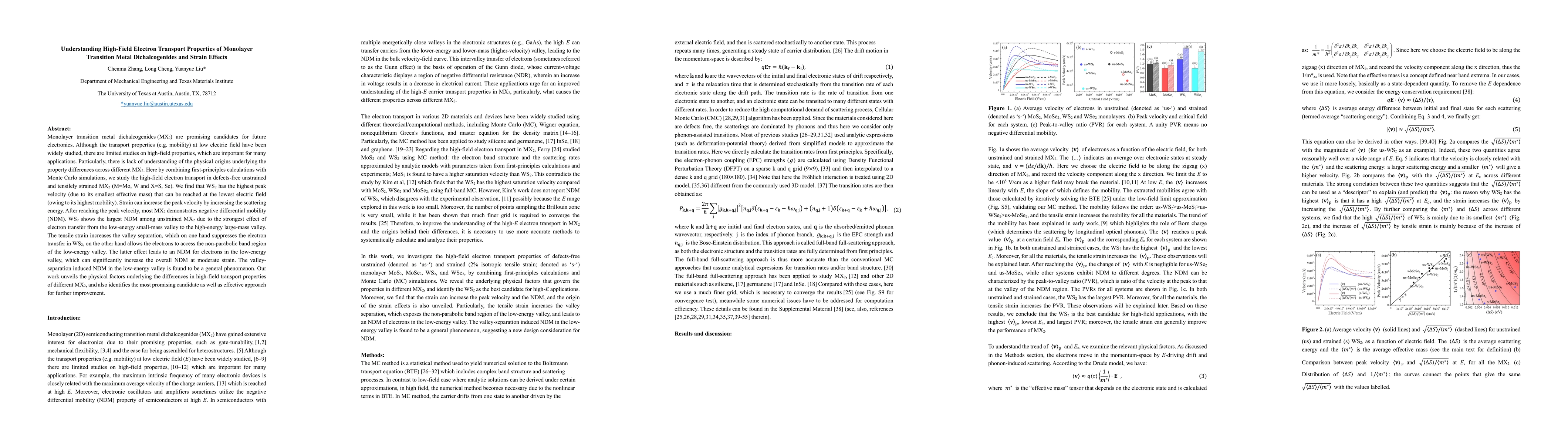 This paper investigates high-field electron transport in monolayer transition metal dichalcogenides (MX2) using first-principles calculations and Monte Carlo simulations. It finds that WS2 exhibits the highest peak velocity due to its smallest effective mass, and tensile strain can significantly enhance negative differential mobility by altering valley separation and electron transfer dynamics.