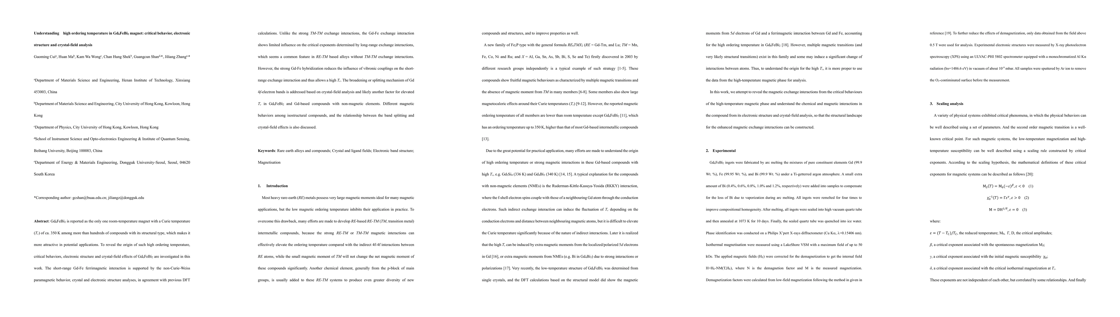 Gd6FeBi2 is reported as the only one room-temperature magnet with a Curie temperature (Tc) of ca. 350 K among more than hundreds of compounds with its structural type, which makes it more attractive in potential applications. To reveal the origin of such high ordering temperature, critical behaviors, electronic structure and crystal-field effects of Gd6FeBi2 are investigated in this work. The short-range Gd-Fe ferrimagnetic interaction is supported by the non-Curie-Weiss paramagnetic behavior, crystal and electronic structure analyses, in agreement with previous DFT calculations. Unlike the strong TM-TM exchange interactions, the Gd-Fe exchange interaction shows limited influence on the critical exponents determined by long-range exchange interactions, which seems a common feature in RE-TM based alloys without TM-TM exchange interactions. However, the strong Gd-Fe hybridization reduces the influence of vibronic couplings on the short-range exchange interaction and thus allows a high Tc. The broadening or splitting mechanism of Gd 4f-electron bands is addressed based on crystal-field analysis and likely another factor for elevated Tc in Gd6FeBi2 and Gd-based compounds with non-magnetic elements. Different magnetic behaviors among isostructural compounds, and the relationship between the band splitting and crystal-field effects is also discussed.