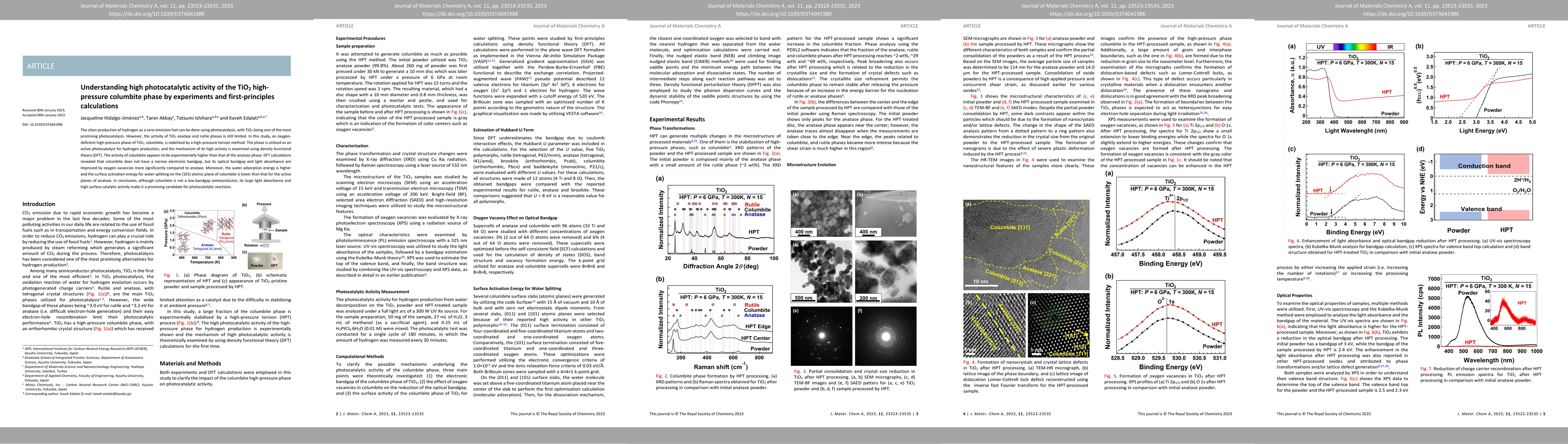 The clean production of hydrogen as a zero-emission fuel can be done using photocatalysis, with TiO2 being one of the most promising photocatalysts. However, the activity of TiO2 anatase and rutile phases is still limited. In this study, an oxygen-deficient high-pressure phase of TiO2, columbite, is stabilized by a high-pressure torsion method. The phase is utilized as an active photocatalyst for hydrogen production, and the mechanism of its high activity is examined using density functional theory (DFT). The activity of columbite appears to be experimentally higher than that of the anatase phase. DFT calculations revealed that columbite does not have a narrow electronic bandgap, but its optical bandgap and light absorbance are improved by oxygen vacancies more significantly compared to anatase. Moreover, the water adsorption energy is higher and the surface activation energy for water splitting on the (101) atomic plane of columbite is lower than that for the active planes of anatase. In conclusion, although columbite is not a low-bandgap semiconductor, its large light absorbance and high surface catalytic activity make it a promising candidate for photocatalytic reactions.