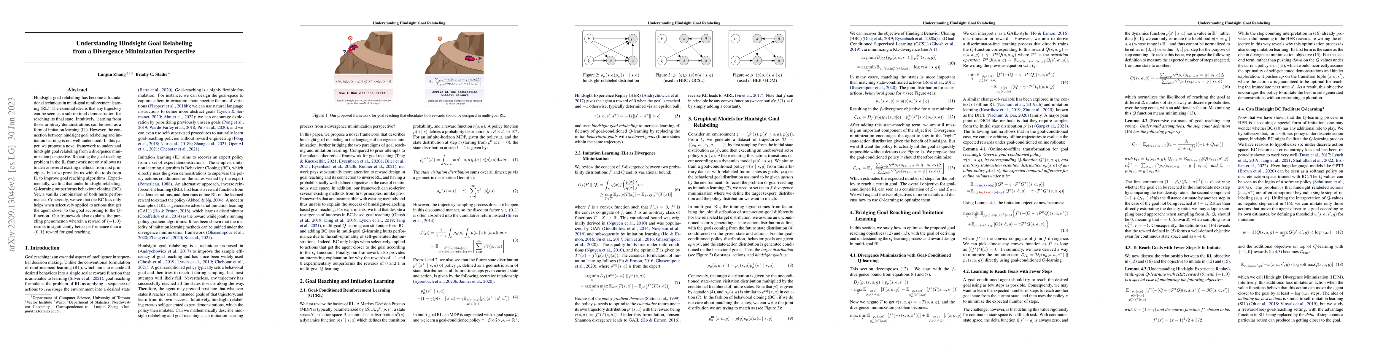 This paper proposes a divergence minimization framework to understand hindsight goal relabeling in multi-goal reinforcement learning, showing that Q-learning outperforms behavioral cloning when selectively applied. It also explains why a (-1, 0) reward scheme is more effective than a (0, 1) for goal reaching.