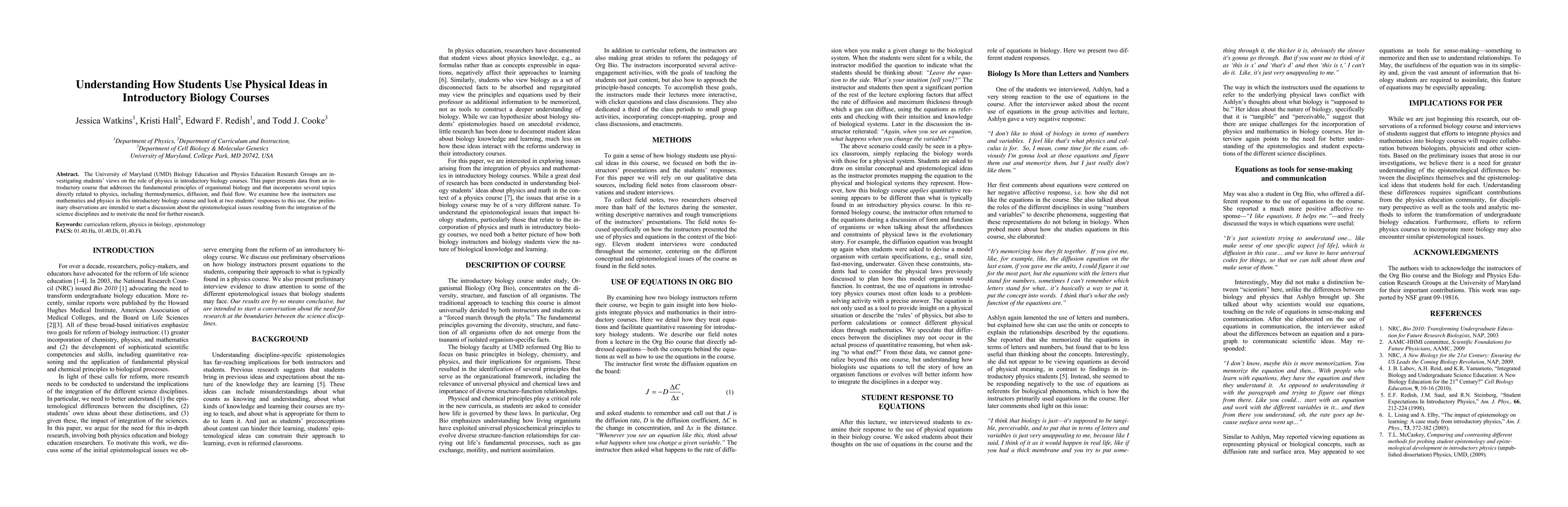 The University of Maryland (UMD) Biology Education and Physics Education Research Groups are investigating students' views on the role of physics in introductory biology courses. This paper presents data from an introductory course that addresses the fundamental principles of organismal biology and that incorporates several topics directly related to physics, including thermodynamics, diffusion, and fluid flow. We examine how the instructors use mathematics and physics in this introductory biology course and look at two students' responses to this use. Our preliminary observations are intended to start a discussion about the epistemological issues resulting from the integration of the science disciplines and to motivate the need for further research.