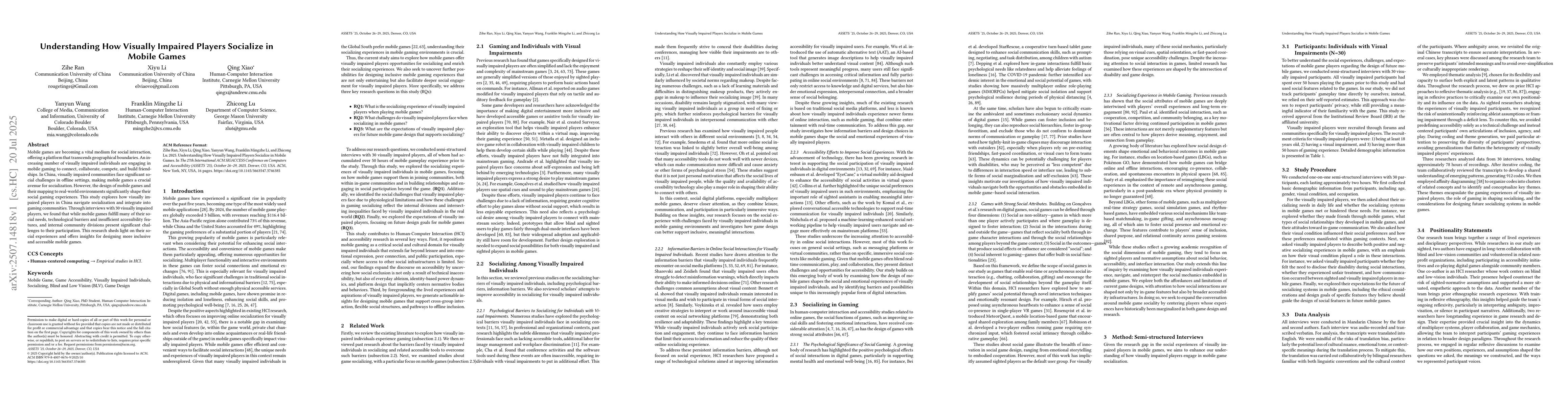 Mobile games are becoming a vital medium for social interaction, offering a platform that transcends geographical boundaries. An increasing number of visually impaired individuals are engaging in mobile gaming to connect, collaborate, compete, and build friendships. In China, visually impaired communities face significant social challenges in offline settings, making mobile games a crucial avenue for socialization. However, the design of mobile games and their mapping to real-world environments significantly shape their social gaming experiences. This study explores how visually impaired players in China navigate socialization and integrate into gaming communities. Through interviews with 30 visually impaired players, we found that while mobile games fulfill many of their social needs, technological barriers and insufficient accessibility features, and internal community divisions present significant challenges to their participation. This research sheds light on their social experiences and offers insights for designing more inclusive and accessible mobile games.