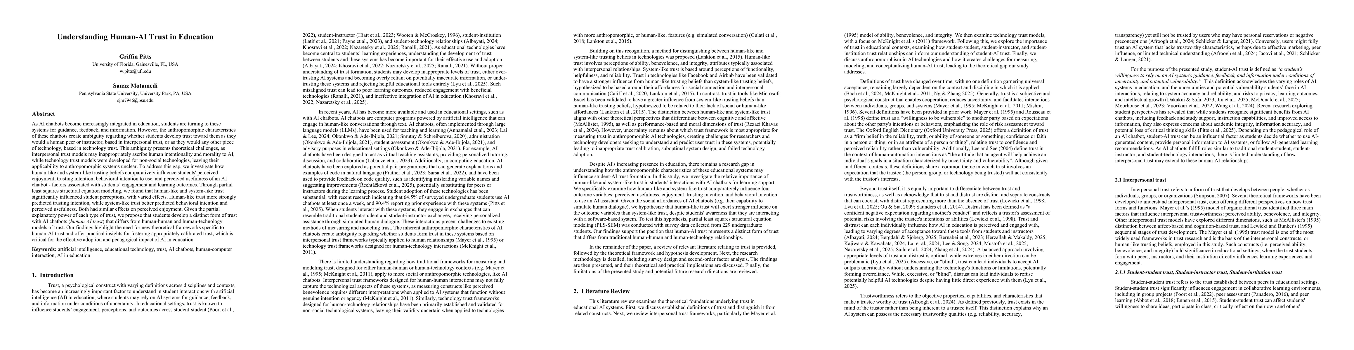 Research found that students develop a distinct form of trust with AI chatbots, combining elements of human-like and technology-based trust, influencing their engagement and learning outcomes.