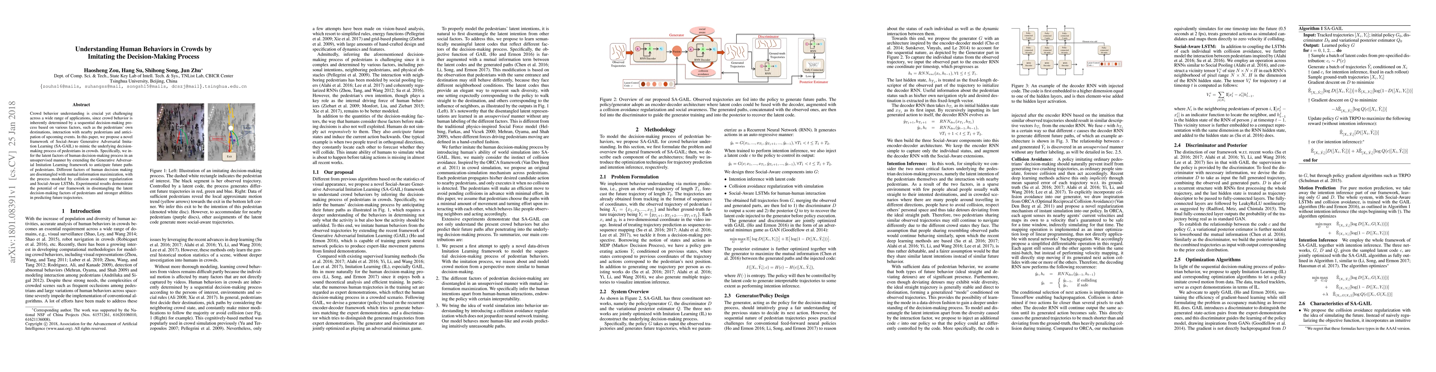Crowd behavior understanding is crucial yet challenging across a wide range of applications, since crowd behavior is inherently determined by a sequential decision-making process based on various factors, such as the pedestrians' own destinations, interaction with nearby pedestrians and anticipation of upcoming events. In this paper, we propose a novel framework of Social-Aware Generative Adversarial Imitation Learning (SA-GAIL) to mimic the underlying decision-making process of pedestrians in crowds. Specifically, we infer the latent factors of human decision-making process in an unsupervised manner by extending the Generative Adversarial Imitation Learning framework to anticipate future paths of pedestrians. Different factors of human decision making are disentangled with mutual information maximization, with the process modeled by collision avoidance regularization and Social-Aware LSTMs. Experimental results demonstrate the potential of our framework in disentangling the latent decision-making factors of pedestrians and stronger abilities in predicting future trajectories.
