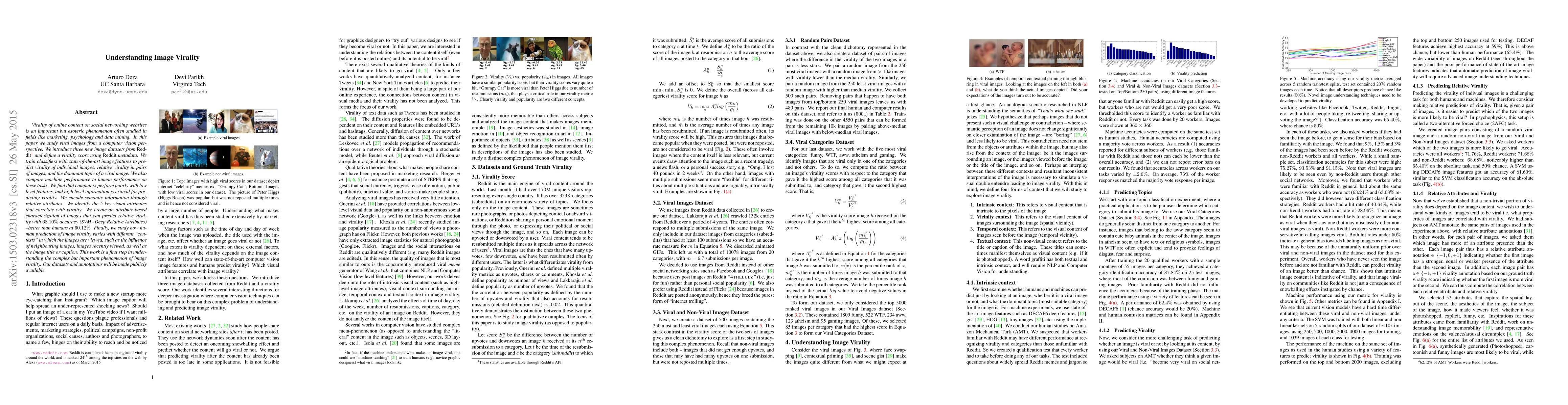 Virality of online content on social networking websites is an important but esoteric phenomenon often studied in fields like marketing, psychology and data mining. In this paper we study viral images from a computer vision perspective. We introduce three new image datasets from Reddit, and define a virality score using Reddit metadata. We train classifiers with state-of-the-art image features to predict virality of individual images, relative virality in pairs of images, and the dominant topic of a viral image. We also compare machine performance to human performance on these tasks. We find that computers perform poorly with low level features, and high level information is critical for predicting virality. We encode semantic information through relative attributes. We identify the 5 key visual attributes that correlate with virality. We create an attribute-based characterization of images that can predict relative virality with 68.10% accuracy (SVM+Deep Relative Attributes) -- better than humans at 60.12%. Finally, we study how human prediction of image virality varies with different `contexts' in which the images are viewed, such as the influence of neighbouring images, images recently viewed, as well as the image title or caption. This work is a first step in understanding the complex but important phenomenon of image virality. Our datasets and annotations will be made publicly available.