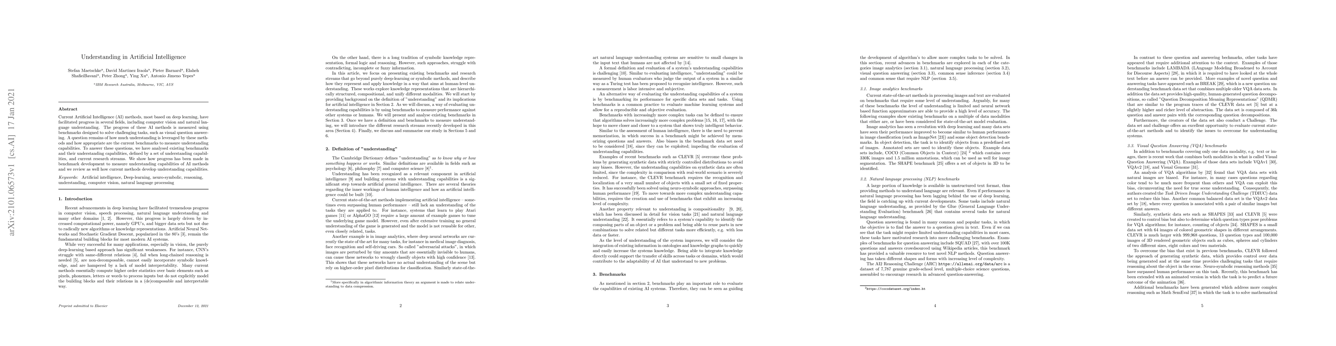 Current Artificial Intelligence (AI) methods, most based on deep learning, have facilitated progress in several fields, including computer vision and natural language understanding. The progress of these AI methods is measured using benchmarks designed to solve challenging tasks, such as visual question answering. A question remains of how much understanding is leveraged by these methods and how appropriate are the current benchmarks to measure understanding capabilities. To answer these questions, we have analysed existing benchmarks and their understanding capabilities, defined by a set of understanding capabilities, and current research streams. We show how progress has been made in benchmark development to measure understanding capabilities of AI methods and we review as well how current methods develop understanding capabilities.