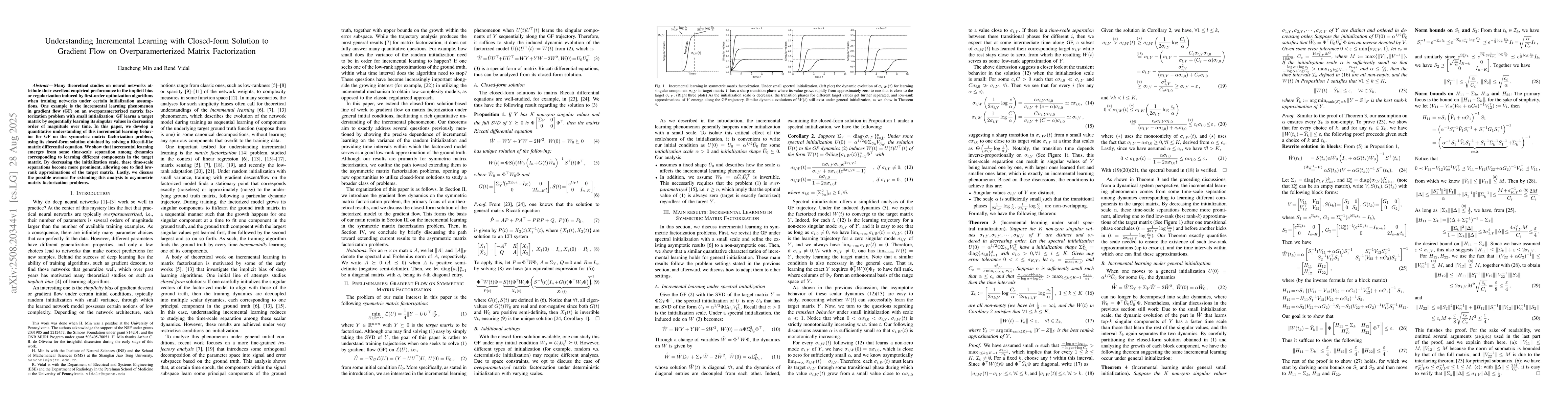 Many theoretical studies on neural networks attribute their excellent empirical performance to the implicit bias or regularization induced by first-order optimization algorithms when training networks under certain initialization assumptions. One example is the incremental learning phenomenon in gradient flow (GF) on an overparamerterized matrix factorization problem with small initialization: GF learns a target matrix by sequentially learning its singular values in decreasing order of magnitude over time. In this paper, we develop a quantitative understanding of this incremental learning behavior for GF on the symmetric matrix factorization problem, using its closed-form solution obtained by solving a Riccati-like matrix differential equation. We show that incremental learning emerges from some time-scale separation among dynamics corresponding to learning different components in the target matrix. By decreasing the initialization scale, these time-scale separations become more prominent, allowing one to find low-rank approximations of the target matrix. Lastly, we discuss the possible avenues for extending this analysis to asymmetric matrix factorization problems.