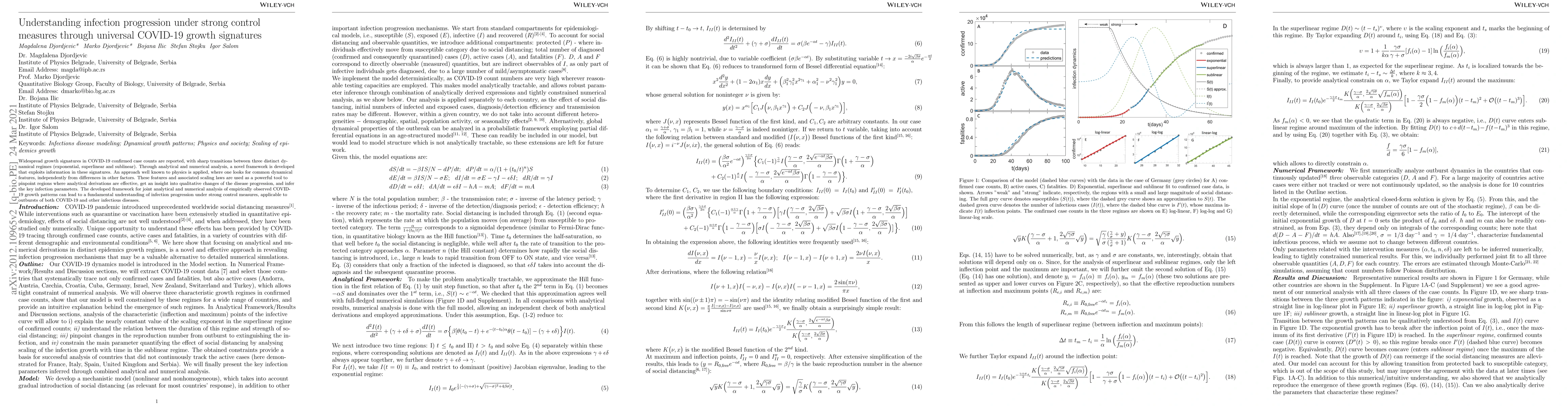Widespread growth signatures in COVID-19 confirmed case counts are reported, with sharp transitions between three distinct dynamical regimes (exponential, superlinear and sublinear). Through analytical and numerical analysis, a novel framework is developed that exploits information in these signatures. An approach well known to physics is applied, where one looks for common dynamical features, independently from differences in other factors. These features and associated scaling laws are used as a powerful tool to pinpoint regions where analytical derivations are effective, get an insight into qualitative changes of the disease progression, and infer the key infection parameters. The developed framework for joint analytical and numerical analysis of empirically observed COVID-19 growth patterns can lead to a fundamental understanding of infection progression under strong control measures, applicable to outbursts of both COVID-19 and other infectious diseases.
