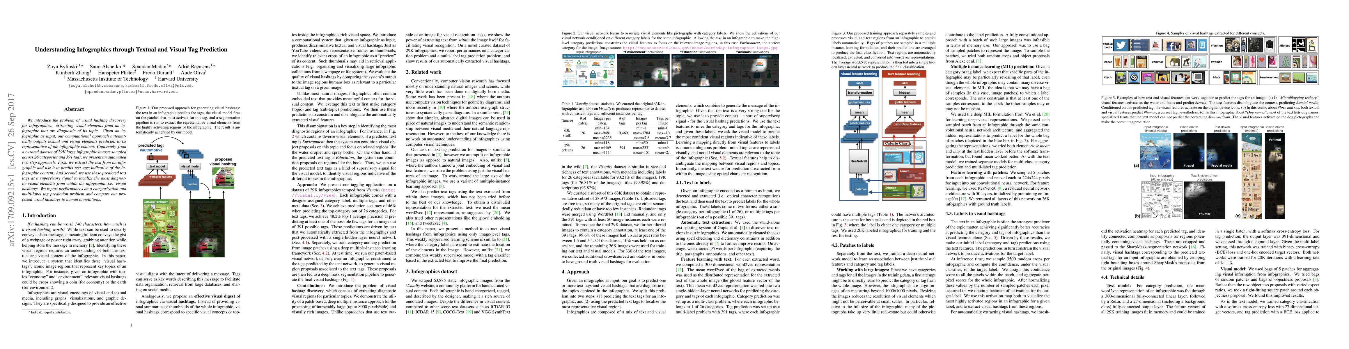 This paper proposes a computational method to automatically extract representative textual and visual elements from infographics, termed visual hashtags, using a two-step approach: first predicting text tags from the infographic's text, and then using these tags to identify key visual elements. The method is evaluated on a dataset of 29K infographics across 26 categories and 391 tags.