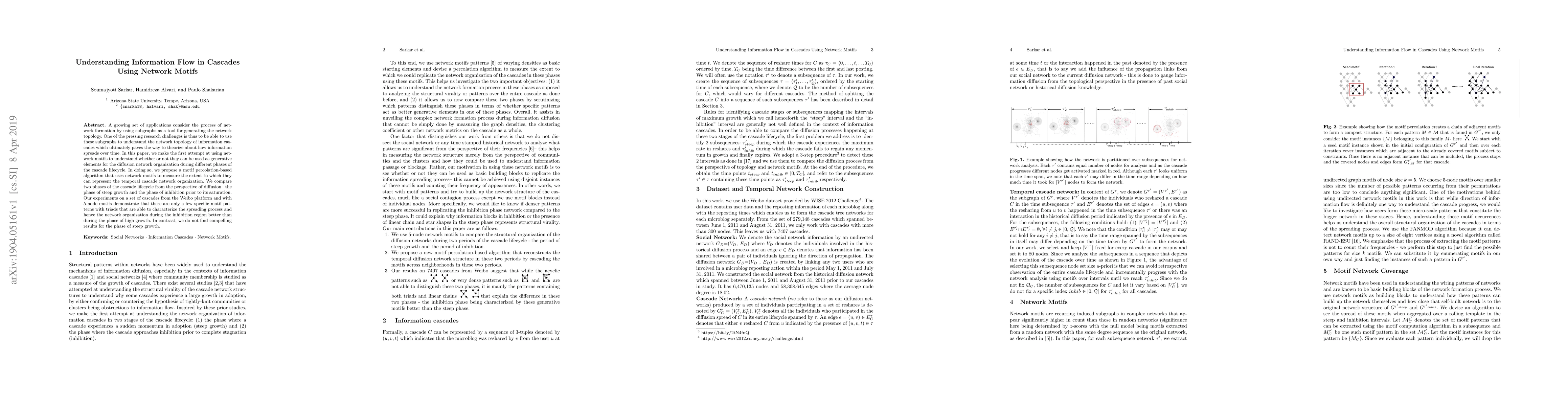This paper explores the use of network motifs to understand information flow in cascades, proposing a motif percolation-based algorithm to analyze diffusion network organization. Experiments on Weibo data show that specific triad motifs better characterize the inhibition phase of cascades compared to the steep growth phase.
