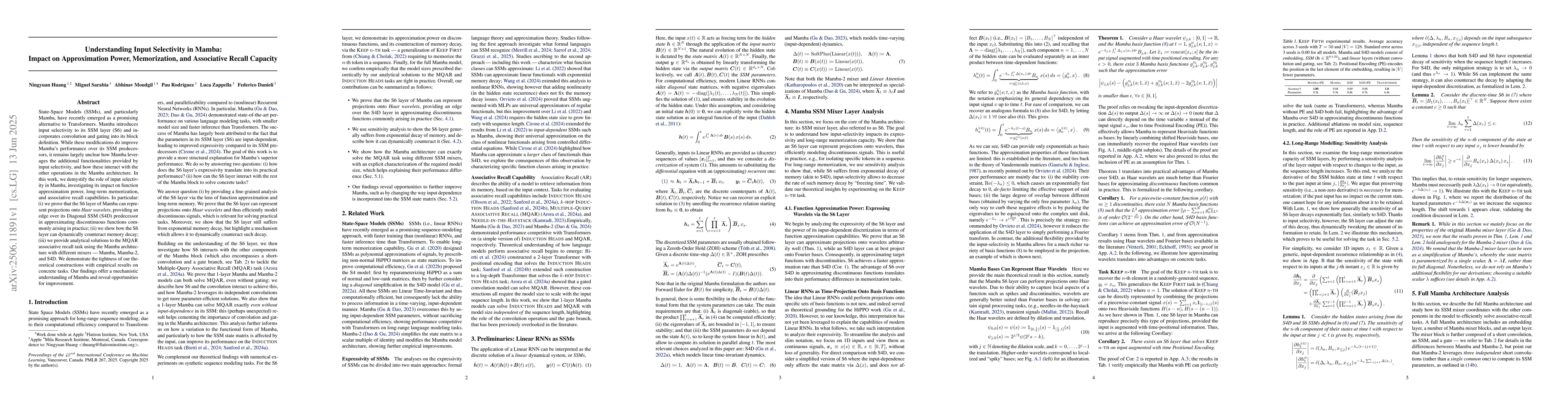 State-Space Models (SSMs), and particularly Mamba, have recently emerged as a promising alternative to Transformers. Mamba introduces input selectivity to its SSM layer (S6) and incorporates convolution and gating into its block definition. While these modifications do improve Mamba's performance over its SSM predecessors, it remains largely unclear how Mamba leverages the additional functionalities provided by input selectivity, and how these interact with the other operations in the Mamba architecture. In this work, we demystify the role of input selectivity in Mamba, investigating its impact on function approximation power, long-term memorization, and associative recall capabilities. In particular: (i) we prove that the S6 layer of Mamba can represent projections onto Haar wavelets, providing an edge over its Diagonal SSM (S4D) predecessor in approximating discontinuous functions commonly arising in practice; (ii) we show how the S6 layer can dynamically counteract memory decay; (iii) we provide analytical solutions to the MQAR associative recall task using the Mamba architecture with different mixers -- Mamba, Mamba-2, and S4D. We demonstrate the tightness of our theoretical constructions with empirical results on concrete tasks. Our findings offer a mechanistic understanding of Mamba and reveal opportunities for improvement.