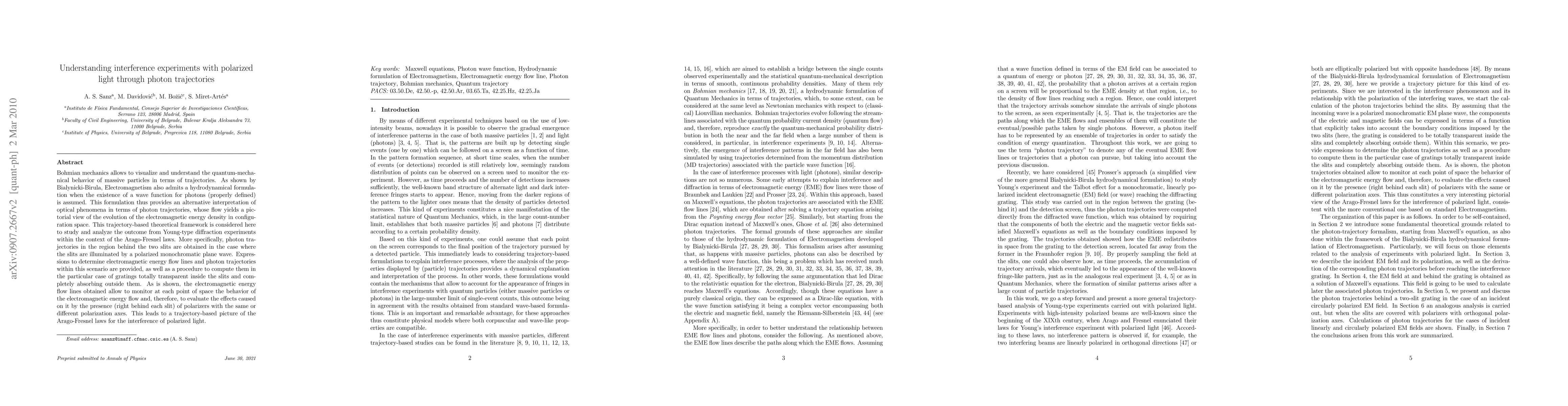 This paper presents a trajectory-based analysis of polarized light interference experiments using Bohmian mechanics extended to photons. It derives expressions for electromagnetic energy flow lines and photon trajectories in Young-type setups with polarized slits, revealing a trajectory picture for Arago-Fresnel laws.