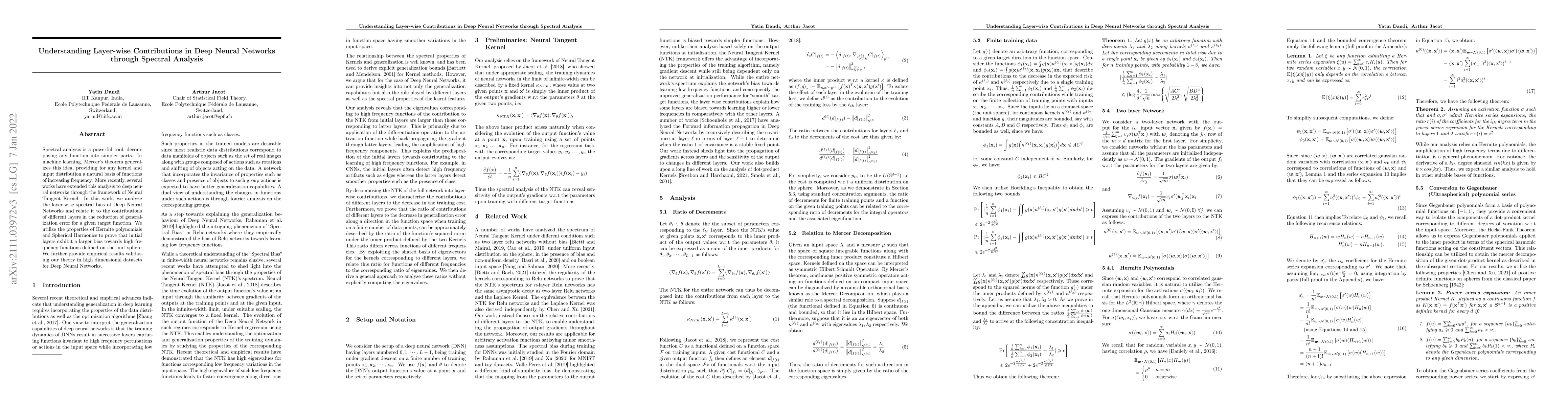 This paper uses spectral analysis to explore layer-wise contributions in deep neural networks, showing that initial layers favor high-frequency functions. Empirical results confirm the theoretical findings on high-dimensional datasets.