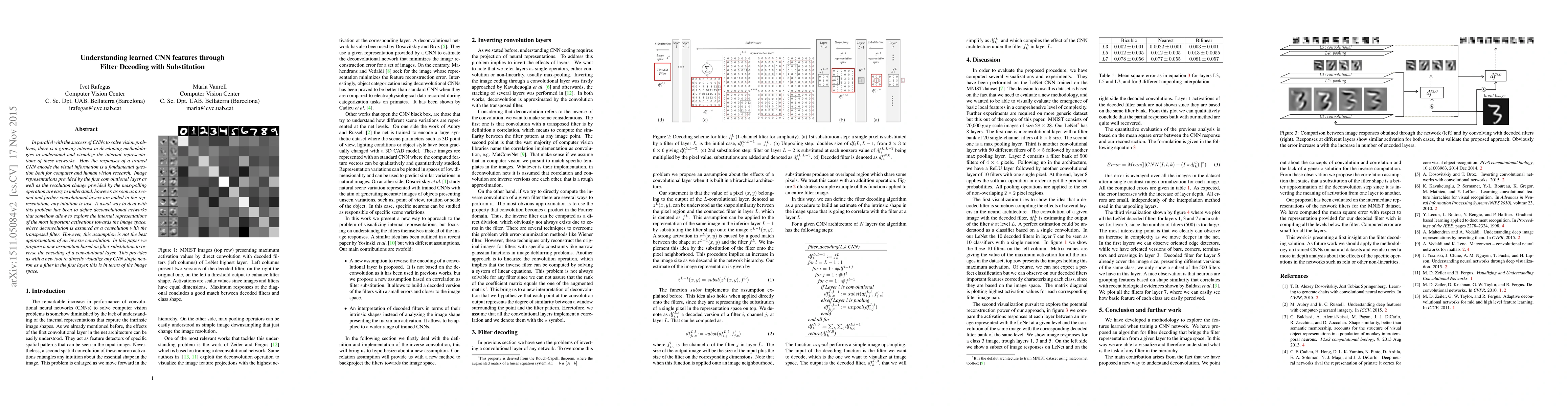 In parallel with the success of CNNs to solve vision problems, there is a growing interest in developing methodologies to understand and visualize the internal representations of these networks. How the responses of a trained CNN encode the visual information is a fundamental question both for computer and human vision research. Image representations provided by the first convolutional layer as well as the resolution change provided by the max-polling operation are easy to understand, however, as soon as a second and further convolutional layers are added in the representation, any intuition is lost. A usual way to deal with this problem has been to define deconvolutional networks that somehow allow to explore the internal representations of the most important activations towards the image space, where deconvolution is assumed as a convolution with the transposed filter. However, this assumption is not the best approximation of an inverse convolution. In this paper we propose a new assumption based on filter substitution to reverse the encoding of a convolutional layer. This provides us with a new tool to directly visualize any CNN single neuron as a filter in the first layer, this is in terms of the image space.