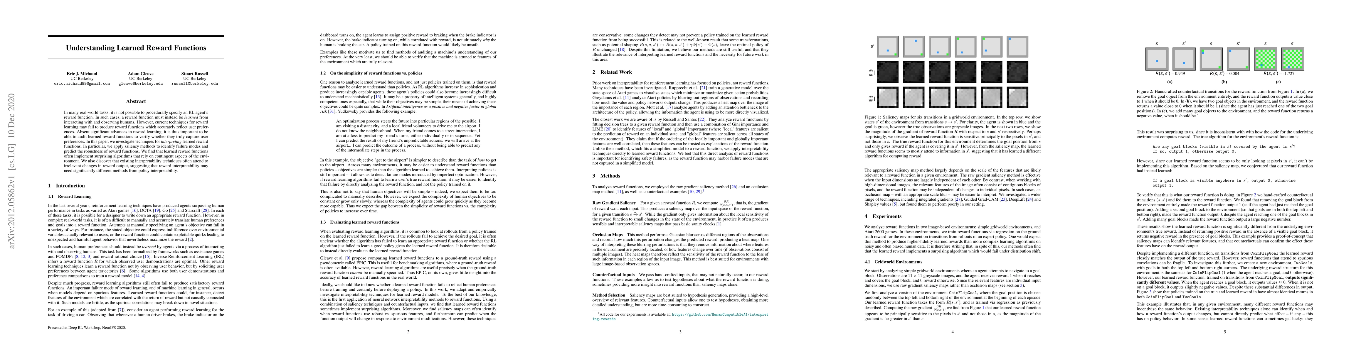 This paper explores techniques for interpreting learned reward functions in reinforcement learning, focusing on identifying failure modes and assessing robustness through saliency methods. It finds that these functions often implement unexpected algorithms based on environmental contingencies and highlights the need for distinct interpretability methods compared to policy interpretability.