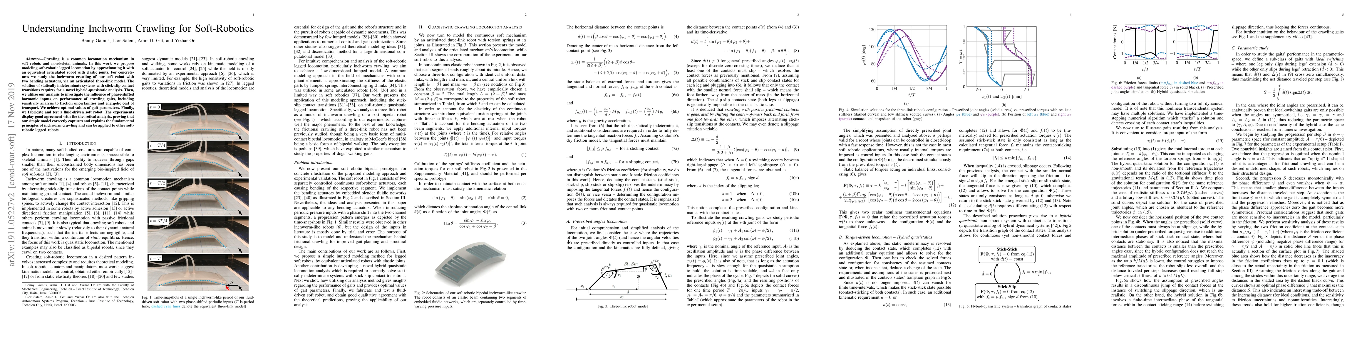 Crawling is a common locomotion mechanism in soft robots and nonskeletal animals. In this work we propose modeling soft-robotic legged locomotion by approximating it with an equivalent articulated robot with elastic joints. For concreteness we study our soft robot with two bending actuators via an articulated three-link model. The solution of statically indeterminate systems with stick-slip contact transitions requires for a novel hybrid-quasitatic analysis. Then, we utilize our analysis to investigate the influence of phase-shifted harmonic inputs on performance of crawling gaits, including sensitivity analysis to friction uncertainties and energetic cost of transport. We achieve optimal values of gait parameters. Finally, we fabricate and test a fluid-driven soft robot. The experiments display remarkable agreement with the theoretical analysis, proving that our simple model correctly captures and explains the fundamental principles of inchworm crawling and can be applied to other soft-robotic legged robots.